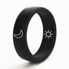 moon and sun in all black ring Details Flip Rings are medical grade silicone, hypo-allergenic, ultra-comfortable, waterproof and won't rub off on your skin or clothes. Weight: Incredibly light Width: 6mm Thickness: 2mm Size Flip Rings are one size. They are designed to fit snug but will stretch and conform to your finger. Technically speaking they are a size 7 (17.2mm diameter) which is the average women's ring size in the U.S. Not sure what your ring size is - it doesn't matter. Wear them on any finger, thumb or even toes. It's all good.
