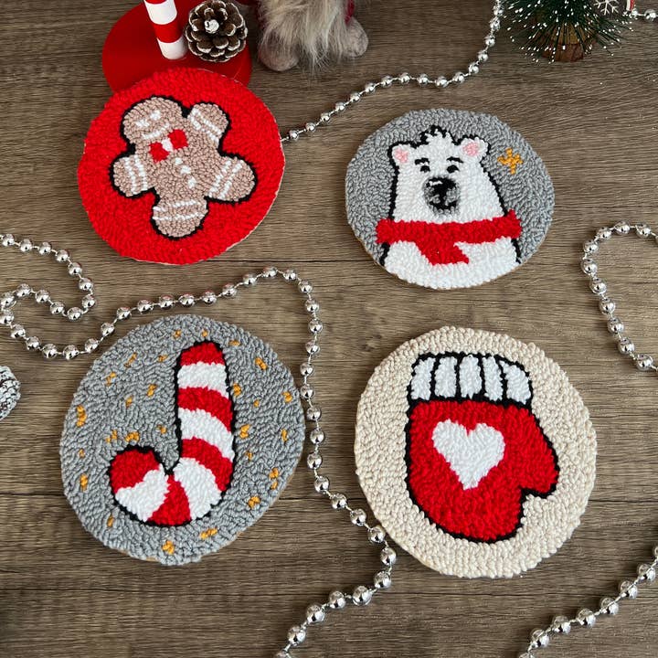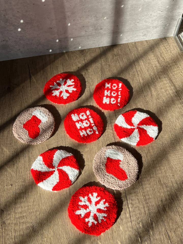 Are you looking for the perfect Christmas gift? Look no further than our cosy Christmas mug rugs! These festive punch needle coasters are perfect for anyone who loves a little Christmas cheer in their home. Our handmade punch needle coasters are a fun way to add extra joy to any moment with your loved ones, and our tufted coasters make a great addition to anyone's decoration. So don't wait any longer - order your cosy Christmas-themed mug rugs today! DIMENSIONS ⭐️10cm diameter approx. (4 inches) STYLE ⭐️ Hand-made using the punch needle technique ⭐️100% Natural Cotton Yarn or 50% cotton 50% acrylic yarn ⭐️Punch Needled on a linen fabric ⭐️Backing with a plain felt fabric ⭐️Each coaster will be unique and may vary slightly ⭐️Spot cleaning with a damp cloth
