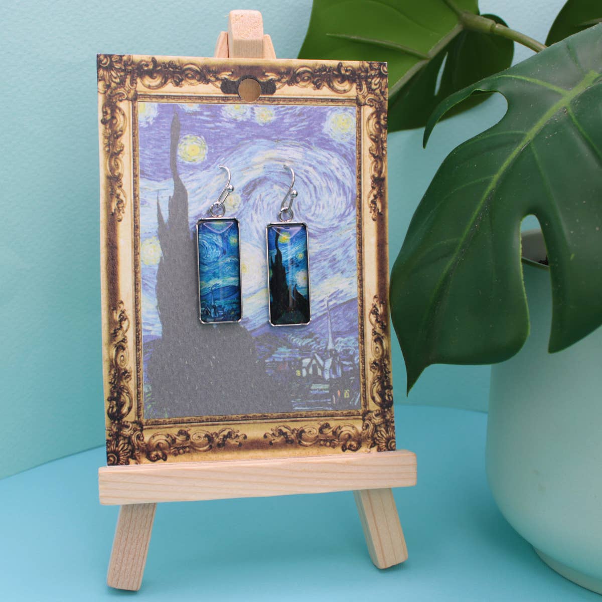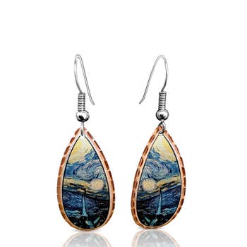 Van Gogh earrings, "Starry night." Dress them up or down, perfect for art enthusiasts. Created from up-cycled tea tray. A variety pack of 12 pairs of up-cycled earrings: These photos represent the various unique styles of what you will receive. A mix of long. medium and short earrings to delight your customers. Each pair is meticulously crafted, with the edges hand-sanded by me. Hooks are 925 sterling silver or 925 sterling gold. Recommended retail: $24.00 a pair. I also include earring gift bags for you to use in your shop. (Note that the display stands are not included.) Selling points for up-cycled/repurposed earrings: Affordable Lightweight Asymmetrical and eye-catching styles One-of-a-kind Eco-friendly These are created with small discs on both sides for stability and style.