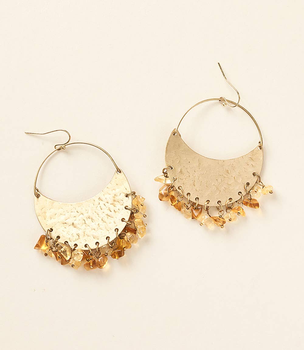 Our alluring Rajani Collection features simple, lunar inspired designs, combining exquisite mother of pearl, gold finish charms, and teal patina accents. Traditional jewelry making techniques of Old Delhi are thoughtfully applied in these refined lunar motifs for a uniquely rich quality. These unique drop earrings feature an eye-catching cascade of full and crescent moon charms handcrafted with mother of pearl and hand hammered, gold finish brass. Dimensions: 3.25"L x 1.25"W All of Matr Boomie's collection is handmade, fair trade and sustainable.