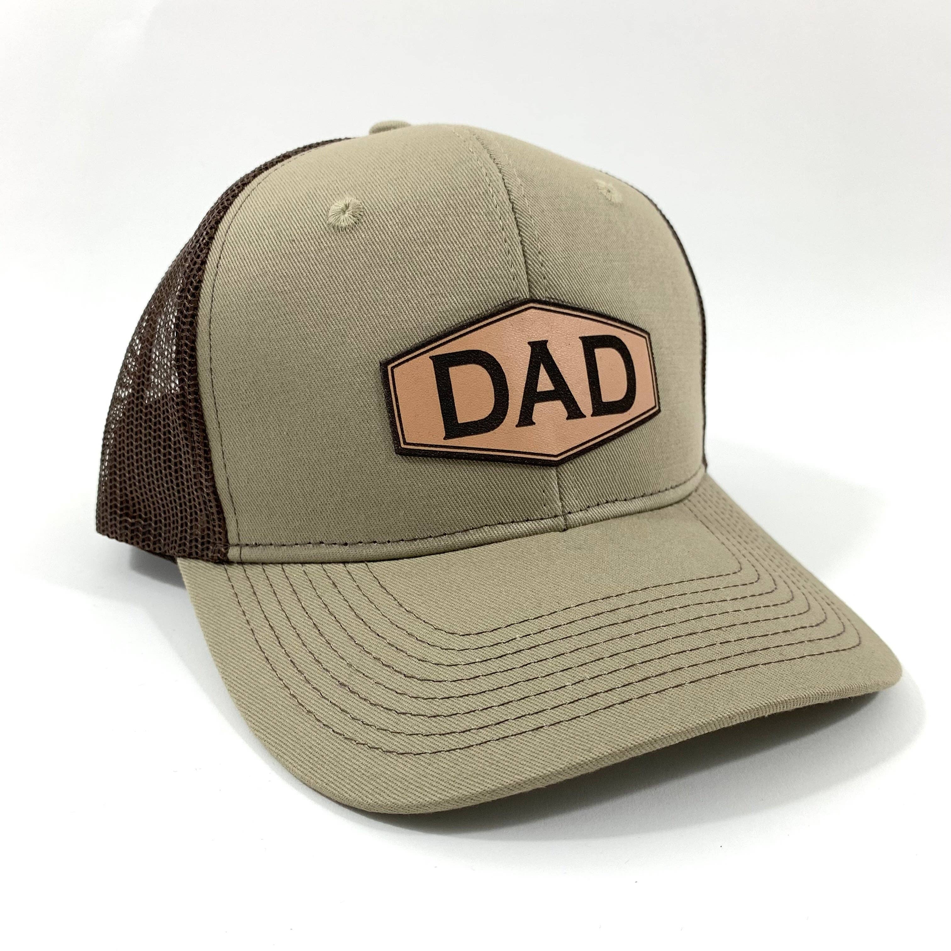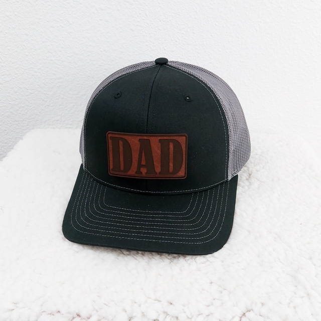 DAD leather patch hat - made with real leather! It's the ultimate Dad hat! Perfect gift for Dad! Classic snapback cap with breathable mesh. Hat color is Black. Fabric: 100% cotton twill front panels and bill Structure: Structured Profile: Mid Closure: 7-position adjustable snapback