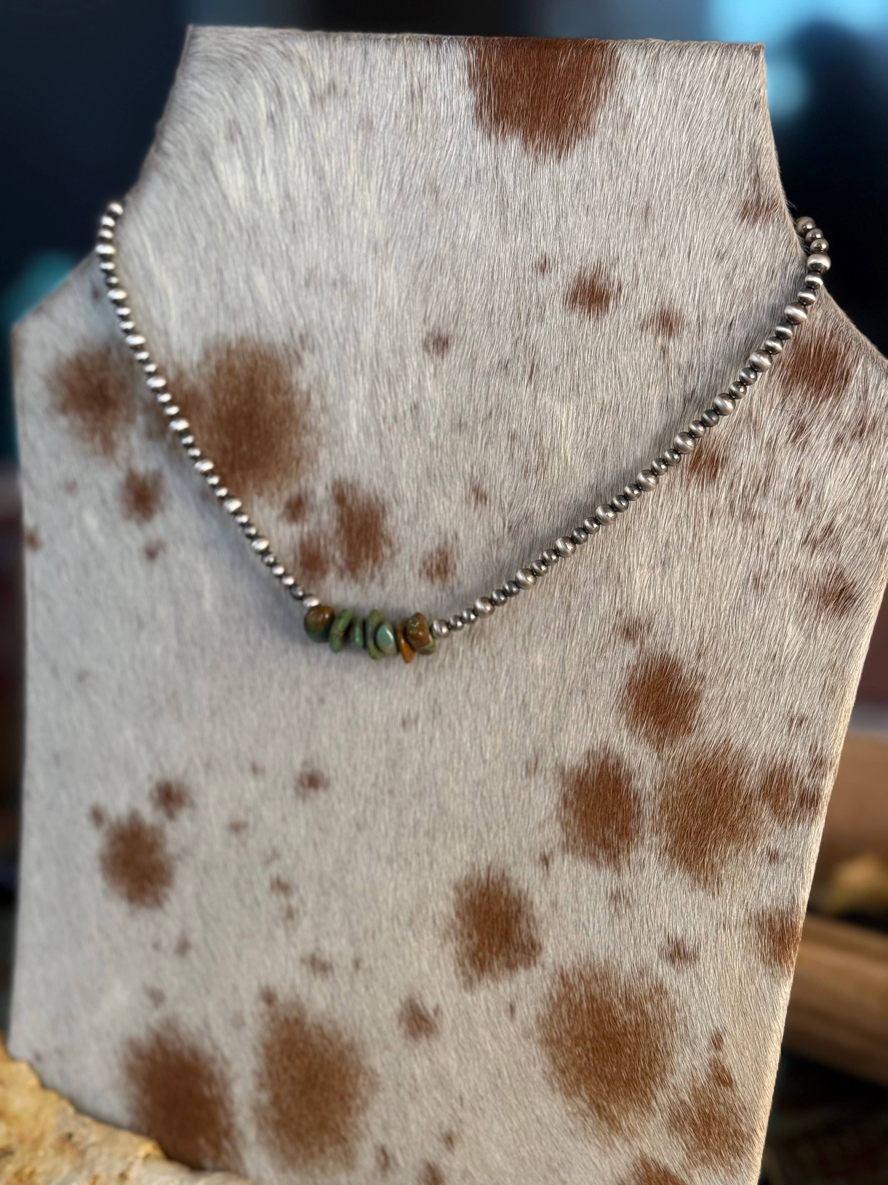 Sterling Silver Pearl Bracelet with Green Turquoise Chip Center. With a rich heritage inspired by Native American culture, each bracelet is handcrafted in Southern Oklahoma, using genuine stones and hand-polished sterling silver pearls. This bracelet is not just an accessory, but a reflection of a rich cultural heritage. Length: 7.5" Materials: Sterling silver pearls, genuine blue turquoise chip beads Pearl Sizes: 4mm & 5mm Finish: Hand-polished Style: Southwestern, artisan, versatile, western, chic, bracelet Closures: Available with sturdy sterling silver clasp or stretch design