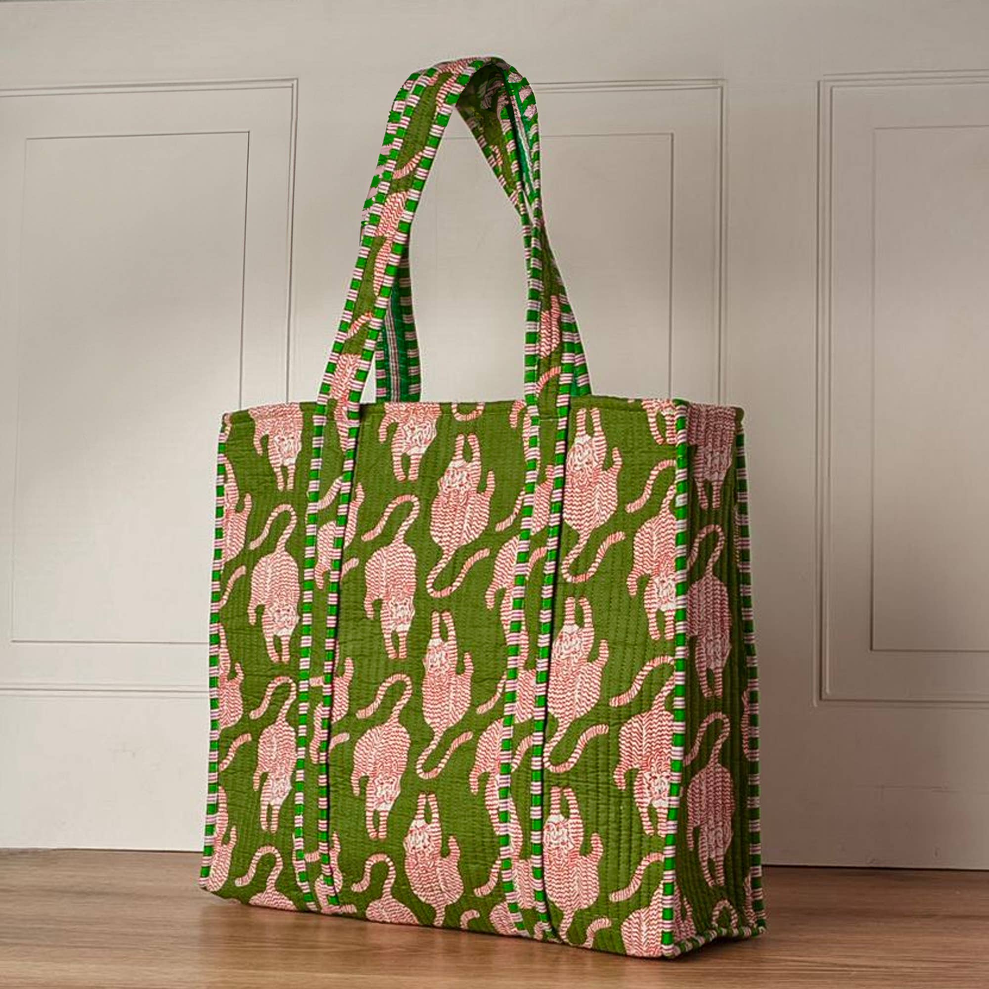 100% Cotton, hand block printed in Jaipur India. 18" x 21" - 4" Gusset