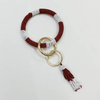 Size : 3.75" D, 8" L Bracelet / Key Ring Key Not include Lead and Nickel Compliant This statement key ring bracelet is crafted with multi-bead detailing and finished with a playful tassel accent. Designed for both style and function, it slips easily onto the wrist, keeping keys secure while doubling as a fashionable accessory. A chic and practical piece perfect for everyday wear.