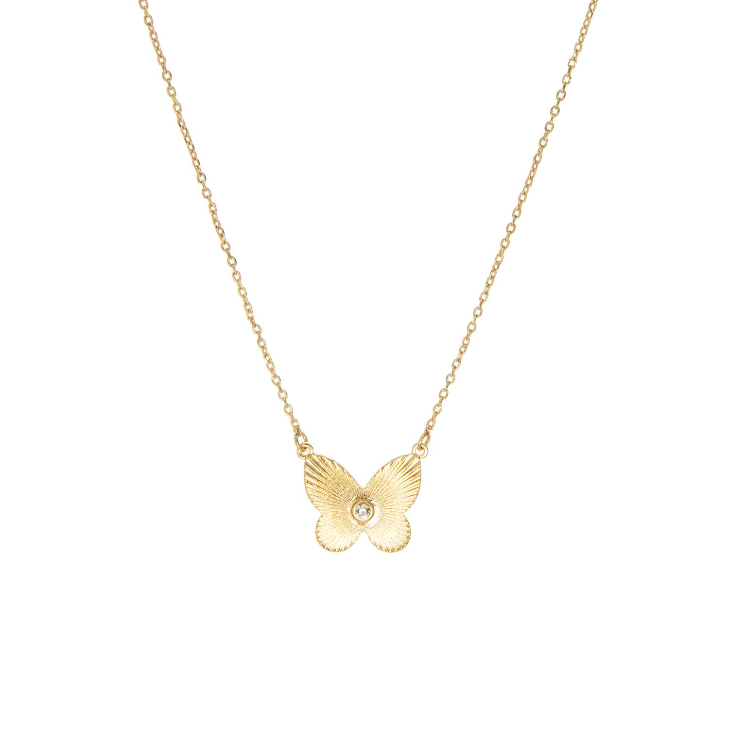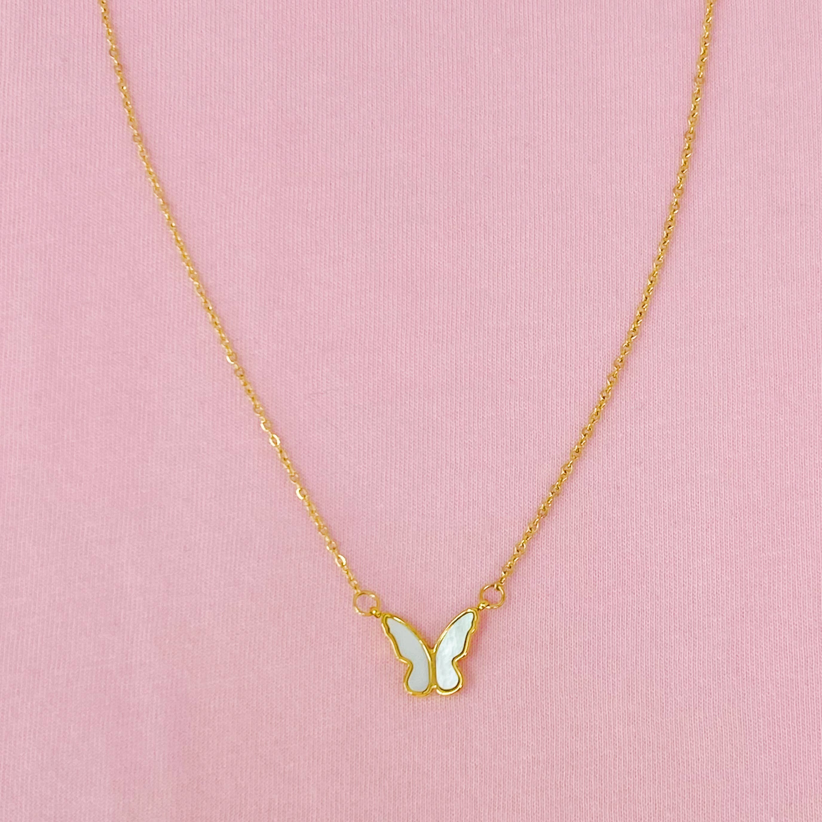 PRODUCT DETAILS * Waterproof💧💧💧 * Stainless Steel * 18K Gold * Hypoallergenic * Nickel Free * Size: 16"+ 3" Extender Closure: Lobster Clasp DESIGNER NOTE The daintiest new piece from the fall collection, the Butterfly Necklace, is the perfect accent piece for your fall layer set. STYLE TIP: Layer with the Beads Chunky Necklace and style with the Zenith Hoops and Huggies for a picnic day glow