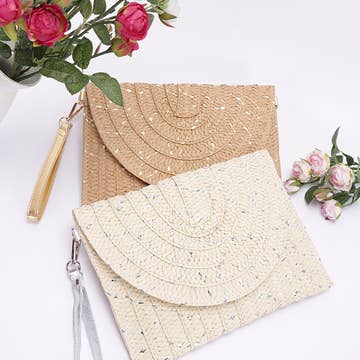 Add a touch of elegance and glamour to your look, this clutch bag reveals an intricate tight woven envelope design. This item adds the perfect finishing touch to any outfit, making it stand out from the crowd. Available in IV, TA. This item is sold in packs of 1. This clutch bag is made with 70%Paper 20%Polyester 10%Pu. Made in China.