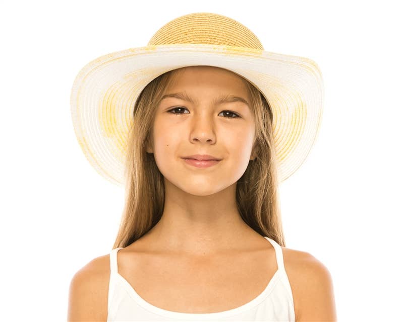 Kid-sized straw lifeguard or surfer hat with fabric-lined brim and crown. Colorful palm tree print. Great for the beach, gardening, hiking, and other outdoor activities. Good sun protection - upf 50+ Crown size: 54 cm Brim: 4 in. 100% natural straw Chin cord with adjustable wooden bead