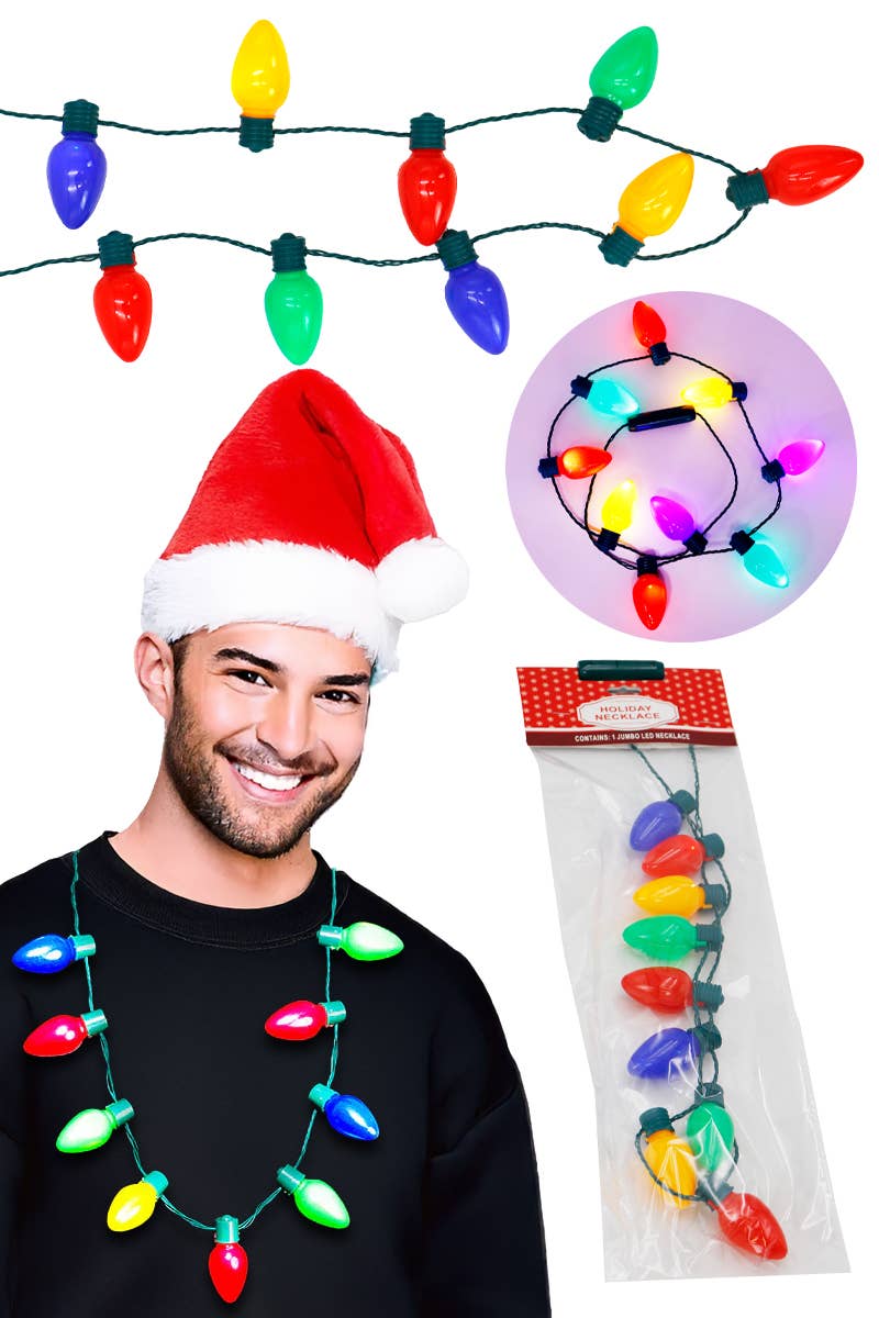 🎄 **Huge Old School Wearable Christmas Light Bulb Necklace** 🎄 🎆 **Dimensions:** - Necklace Length: 40″ - 13 PCS Bulbs: 1.25″ x 2″ 💡 **LED Colors:** White 🔋 **Batteries:** 2 Replaceable AG13 Batteries pre-installed 🔄 **Modes:** Steady, Strobe, Flash, Blink Twinkle, Pulse 🎅 Way back in the seventies who would have thought The huge Christmas house lights our Moms and Dads bought Would come as a necklace that’s easily purchased? Those old Christmas lights are fully repurposed. When you wear this necklace, everyone will see, You’ll be decked with Christmas lights like you’re a Christmas tree. 🎉 **Features:** - Each Huge Old School Christmas Light Bulb Necklace has 13 bulbs, each flashing when turned on. - Comes with a breakaway clasp for easy and safe removal. - To activate, remove the pull tab and press the button on the battery housing. 🎁 Perfect for adding nostalgic charm and festive flair to your holiday celebrations! 🌟