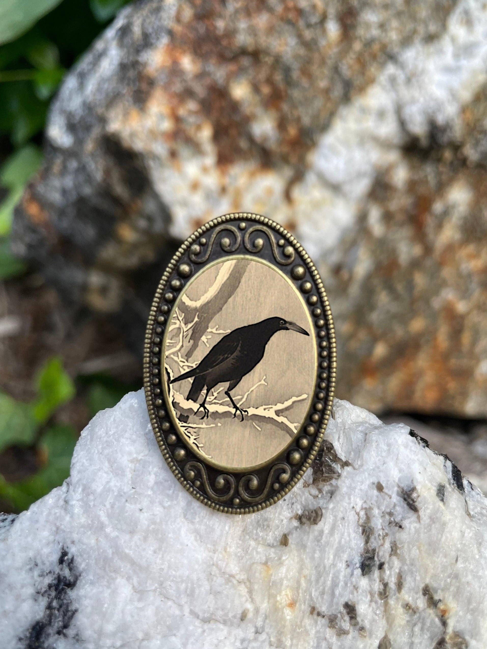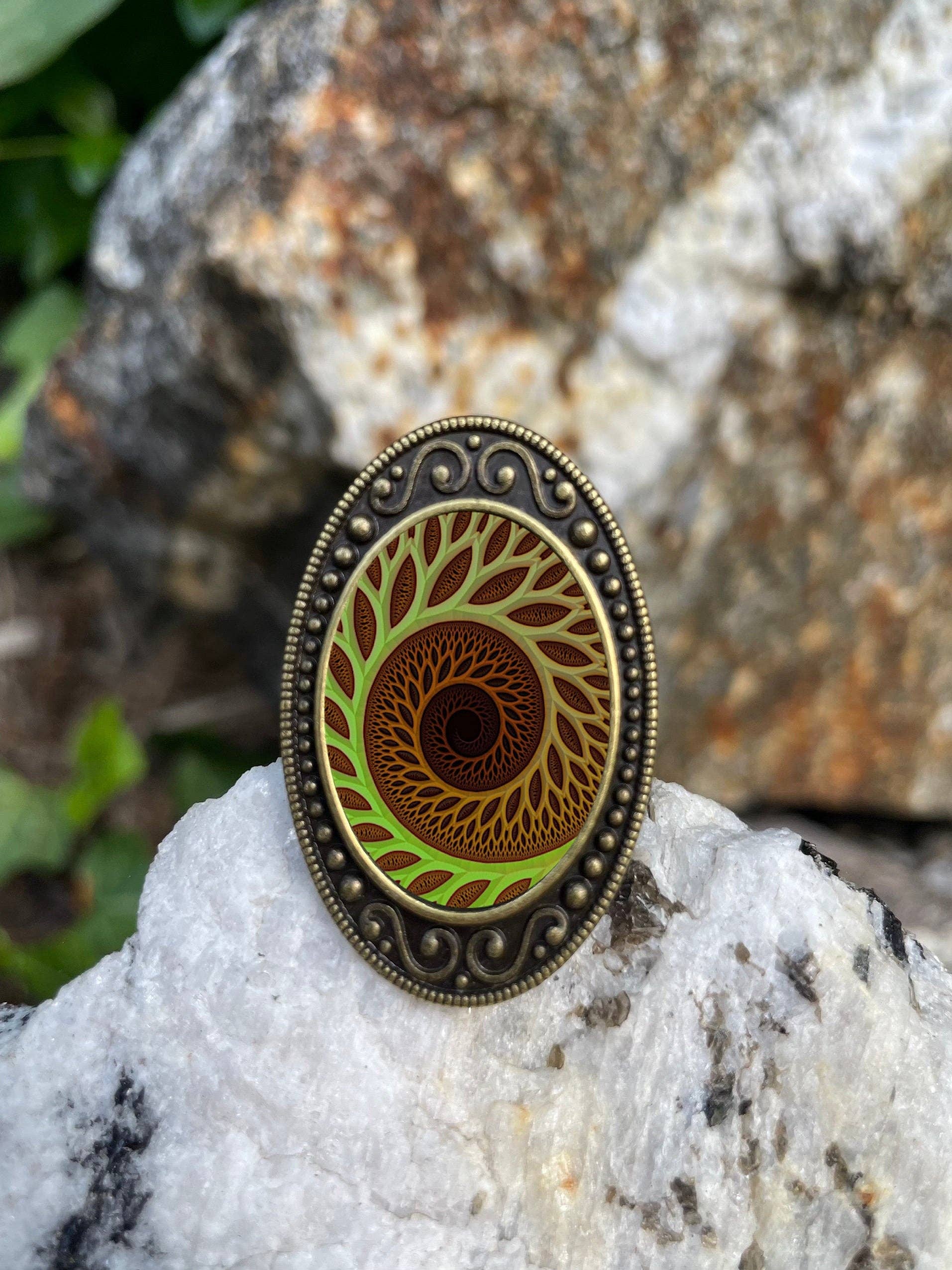 This beautiful, vintage-inspired ring is made of a lightweight metal and plated in antiqued bronze. The front of the ring measures 1 x 1.5 inches. It is adjustable to fit your finger. The front image is protected with an epoxy dome. Designed and shipped by me directly from my studio.