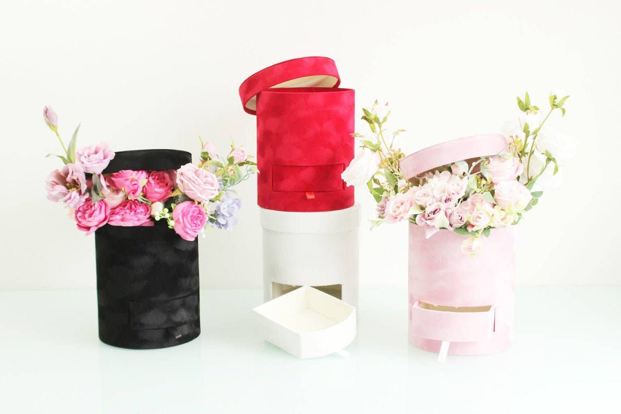 This velvet cube square flower hat box with lid is the perfect accessory for storing and displaying your delicate flowers. Made with high-quality velvet material, it provides a luxurious touch to any arrangement. Its sturdy lid ensures protection and preservation of your flowers, making it a must-have for floral enthusiasts. * Material: Cardboard, Velvet * Color available : Black, Pink, Red & White * Dimensions (W x D x H): (L) 19 x 19 x 17.5 cm / (M) 17 x 17 x 15.5 cm / (S) 15 x 15 x 14 cm * Please allow 1-2cm errors due to manual measurement * Flowers and treats are not included. Important Notice: Hand-Glued Boxes May Have Visible Imperfections Please be aware that the majority of our boxes are hand-glued, and as a result, minor defects such as glue residue, plastic scratches, and small marks are common. Please note that these imperfections will not be considered as damage.