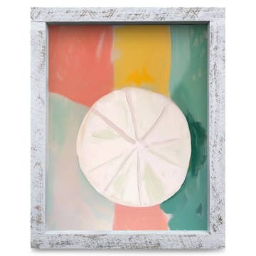This charming 6x6 framed 2d art print features lobster buoys, the original was created from genuine sea glass pieces. Shades of soft frosted tones create a playful coastal palette, while the natural variations in the glass add beautiful texture and authenticity. The artwork is presented in a solid wooden whitewashed frame that is 2" wide and about 1" thick, offering both substance & style. Its distressed wood finish with it's intentional imperfections complement the coastal theme perfectly. Overall outside dimensions are 10x10x1.