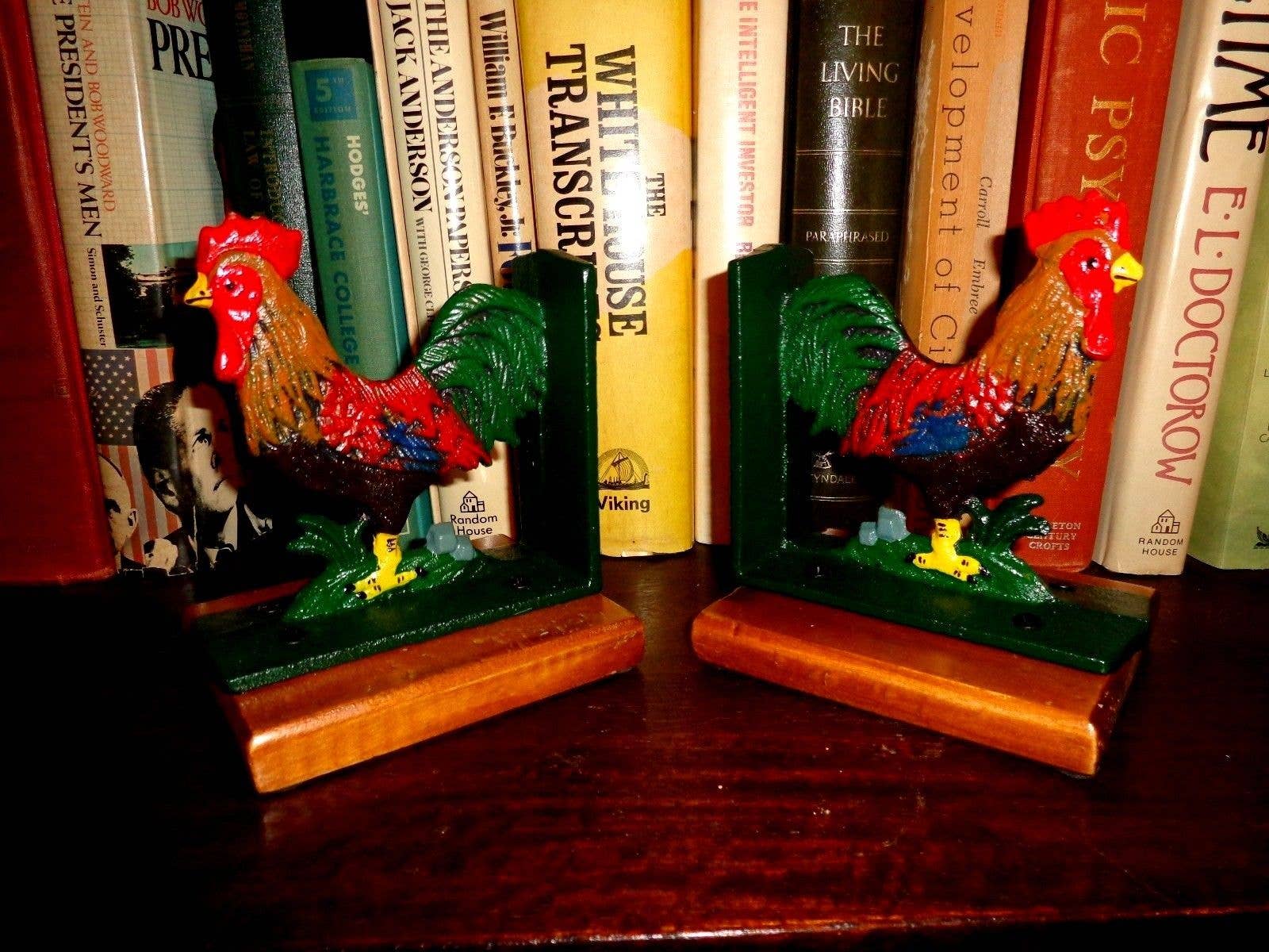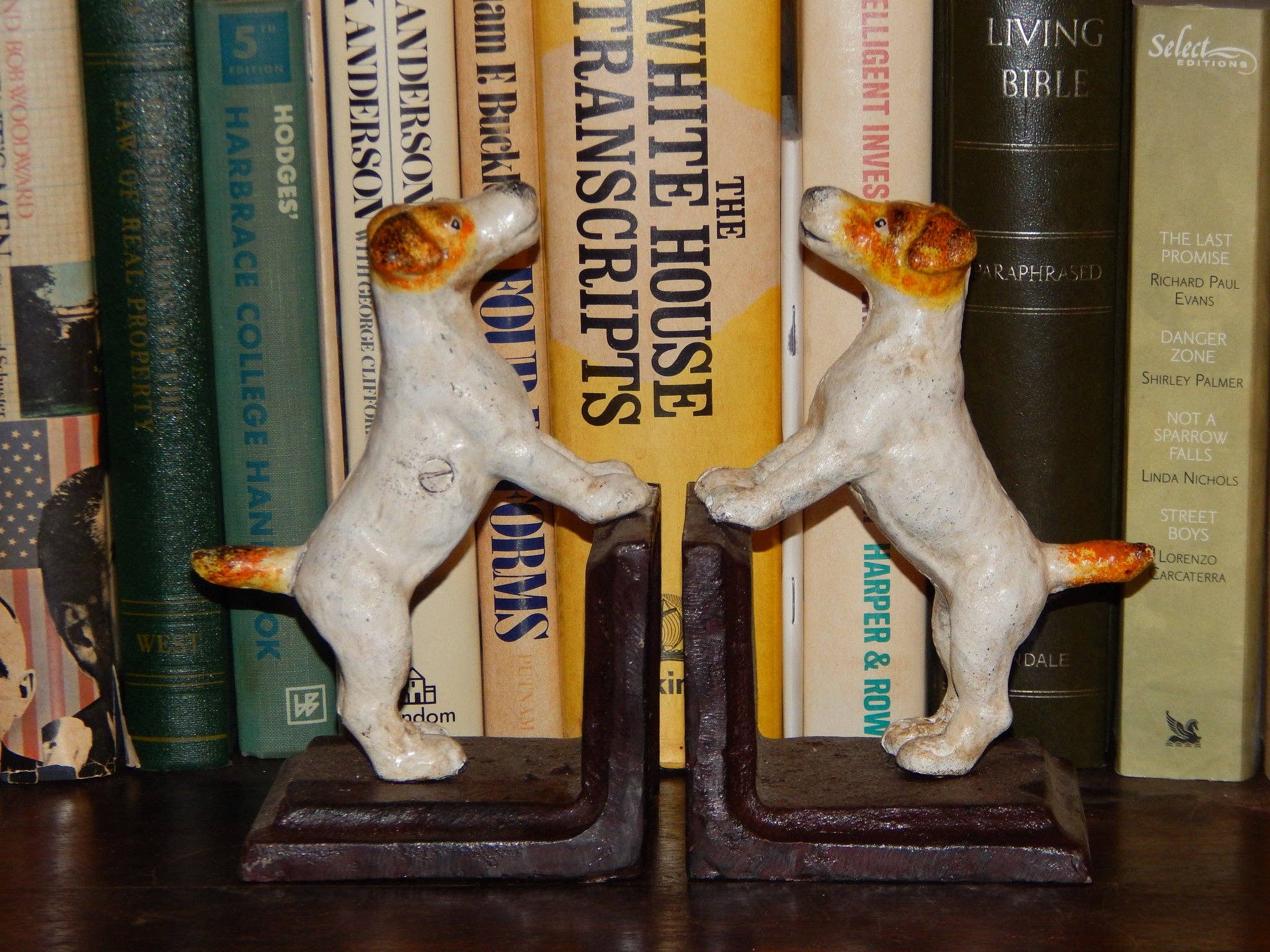 Cast Iron Bookends - Pair Vintage Dogs Pair of White Dog w/Ear Up bookends. These bookends are awesome and have a nice heavy fee. They are hand-painted. Bookends are nicely detailed. Height(Inches): 5.5 Length(Inches): 4.5 Depth(Inches): 3.5