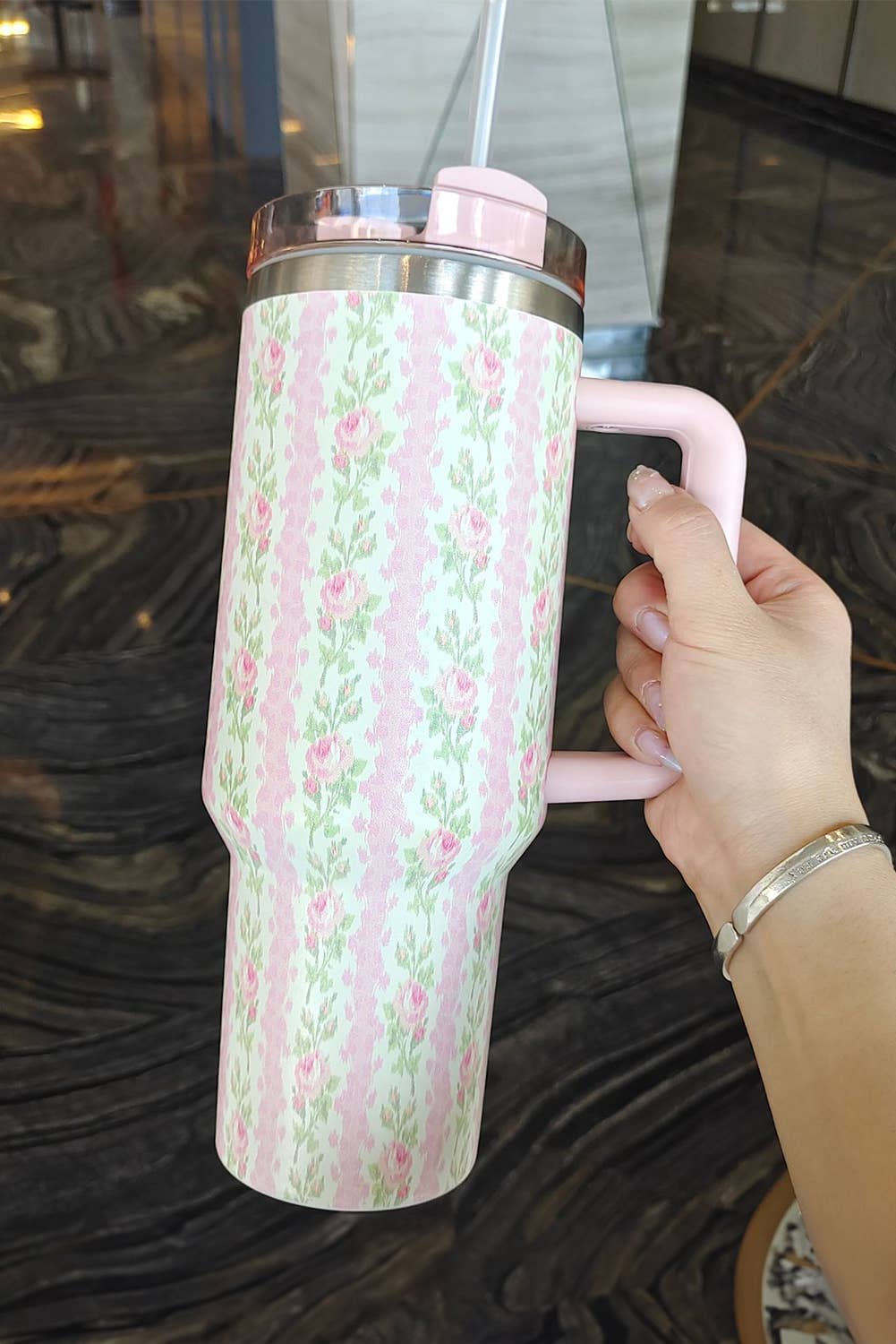 Pink Floral 40oz Tumbler with Spill Proof Lid and Flip Straw