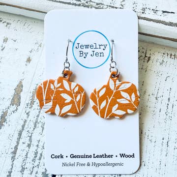 Measures 1" long. Cork bonded to genuine leather. Stainless steel hook. Each pair is unique due the pattern and how the shape is cut. Please Note: Natural imperfections are the nature of cork. It is inherent to its surface and adds to the aesthetic. No two areas may be the exact same and will have naturally occurring marks or colorings related to cork.