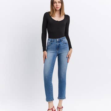 Wholesale High Rise Ripped Frayed Hem Straight Jeans