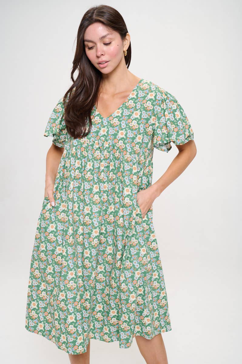 - Floral Print Maxi Dress with Bubble Sleeves - Long bubble sleeves with elastic cuffs - Split V-neck with collar - 3/4 length - Slight high-low tiered hem - Not Lined - Model is 5'9" and is wearing a small. - 80% Rayon. 20% Nylon