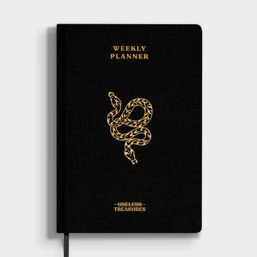 The Perfect Planner is a weekly planner with a hard fabric cover, gold details, and a fabric bookmark. The planner has inner front and back printed covers, and it's just a beauty. It includes 64 weekly spreads, notes, and checklists printed on ivory-colored pages. The planner has an easy flat opening and an envelope on the back to keep receipts, cards, spells, etc. close. Well, yes. It's perfect.  Â