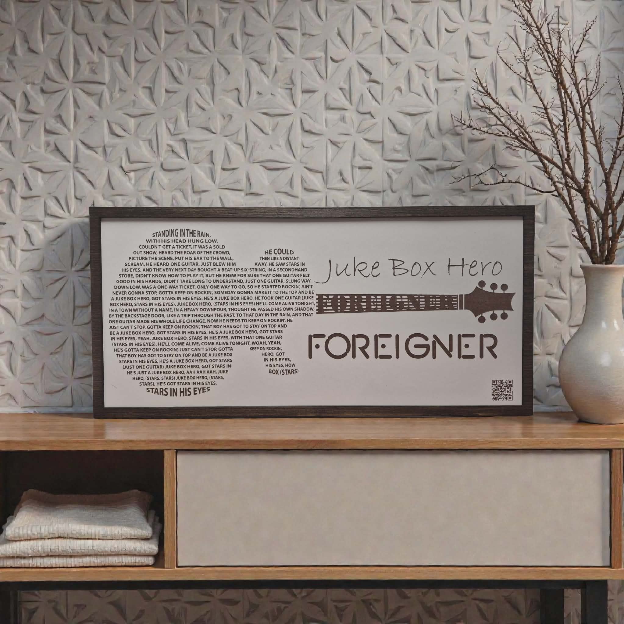~You now have the option to choose if you would like the QR code on the sign that lets you listen to the song! No extra cost! The picture is just an example of what it will look like. ~Sign measures 21"x10"x1/4". Laser engraved on whiteboard canvas and framed(stain) ~This is not vinyl or stickers. The sign is lasered on whiteboard material which is 1/8 thick Sign can be hung by double sided gel tape or any command strips. They are not supplied with the sign because customers usually like to choose the way they hang the items. Signs can be wiped off with rubbing alcohol as they are very easy to clean!