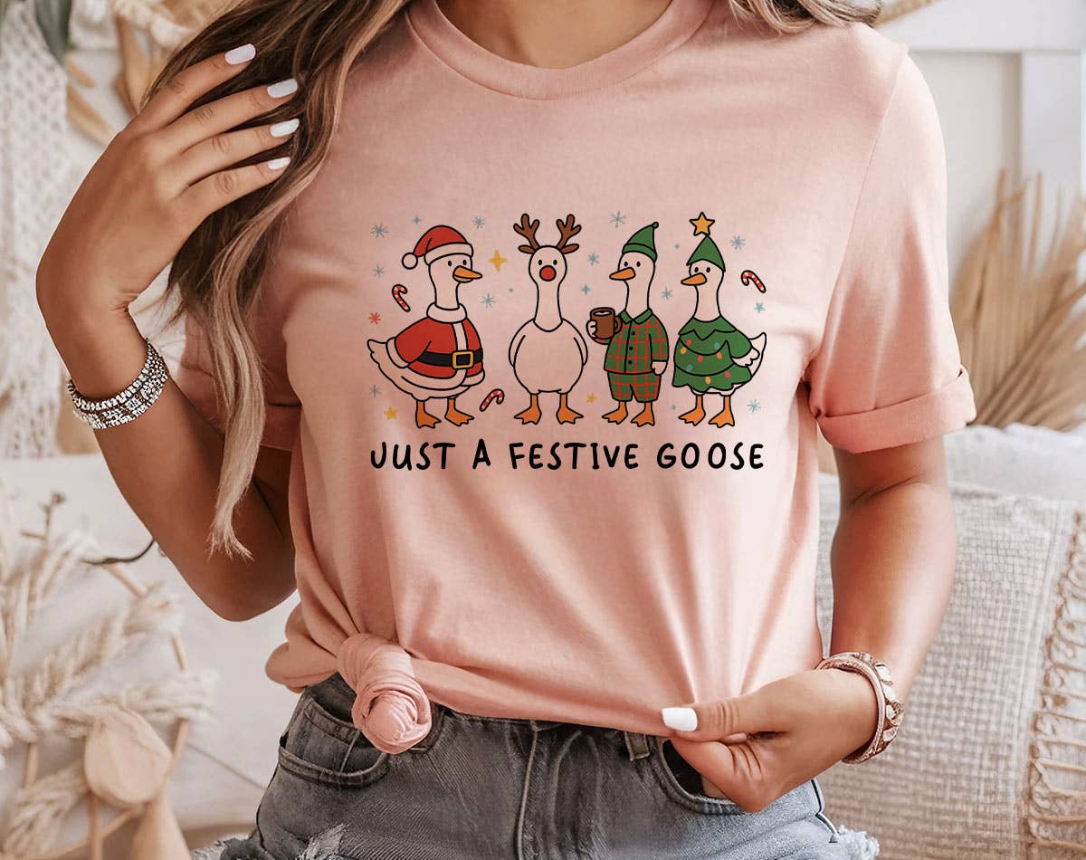 Add a dash of whimsy to your holiday wardrobe with this Christmas Goose design. Featuring a festive goose bundled up in a striped scarf and Santa hat, holding a warm mug of cocoa beside a sack of presents, this tee captures all the cozy charm of Christmas. Surrounded by holly, stars, and candy canes, it’s a lighthearted mix of farmhouse and festive that’s perfect for tree trimming, cookie baking, or holiday movie nights. Comfort Colors : Khaki 6.1 oz./yd² (US), 10 oz/L yd (CA), 100% ring-spun cotton, 30 singles Garment dyed for that lived in feel and almost no shrinkage at home. Soft ring-spun cotton fabric with 100% cotton threads Relaxed fit Topstitched, classic width, rib collar Shoulder to shoulder twill tape Signature twill label Made With Respect Proud member of the U.S. Cotton Trust Protocol Made with OEKO-TEX certified low-impact dyes Our clean pigment dye colors are salt free