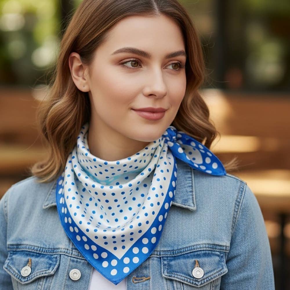 Soft square scarf with beautiful print. Geometrical clover pattern with coordinating colored edge, so chic and edge! Makes great style around the neck, hair, waist as a belt, purses, endless styling uses! Approximately 27.5' x 27.5" 100% Polyester
