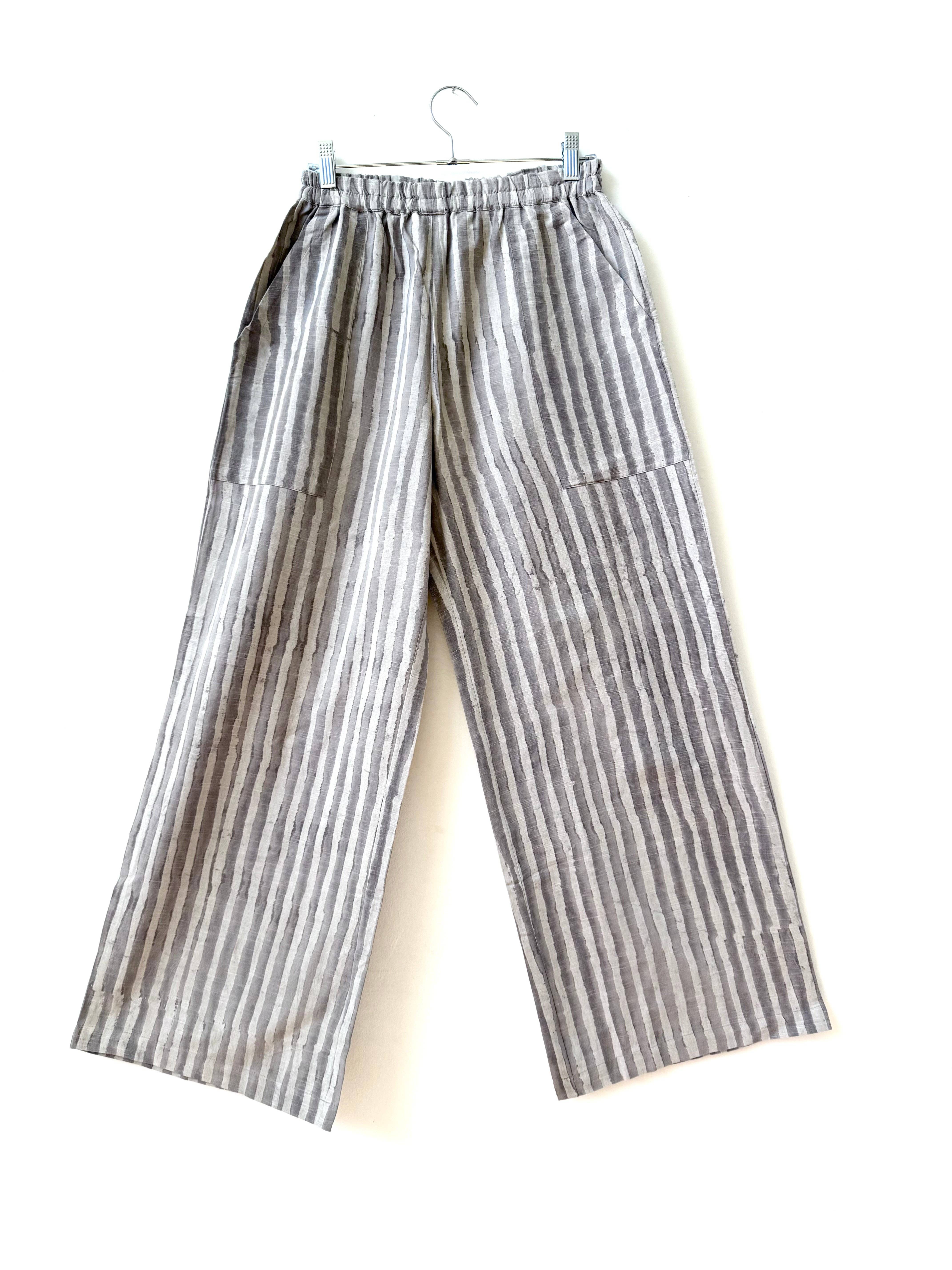 Omar Pants from size XS to XXL. Light fabric. - Elasticated waist - Two side seam pockets Single layered with our light 100% natural hand-woven cotton. Woven by our artisans in our cooperative in India. Preshrunk. These pants have been hand-block printed and dyed with indigo. Dimensions: Total waist relaxed: XS (64.5cm/25.2in), S (69.5cm/27.1in), M (74.5cm/29.3in), L (82cm/32.2in), XL (92cm/36.2n), XXL (102cm/40.1in) Outseam length from top to edge: XS (56.5cm/21.9in), S (57cm/22.1in), M (57.5cm/22.2in), L (58cm/22.4in), XL (58.5cm/22.6in), XXL (59cm/23in) Front rise from top edge: XS (24cm/9.44in), S (25.5cm/9.8in), M (27cm/10.6in), L (29.