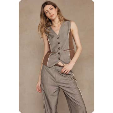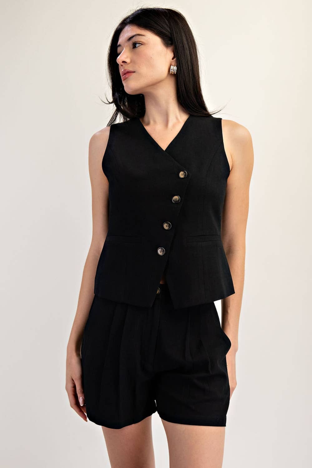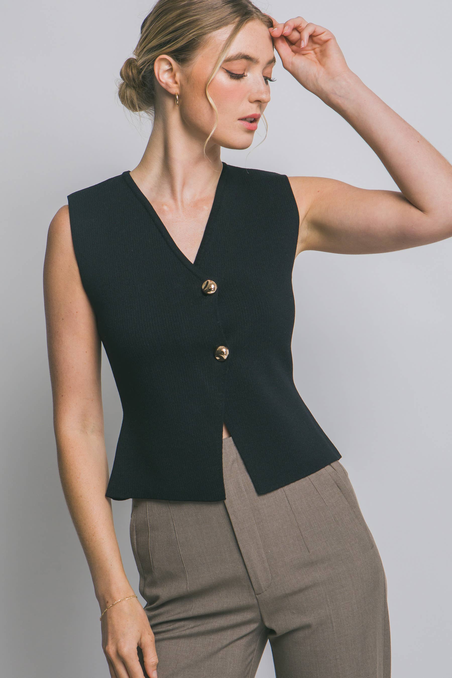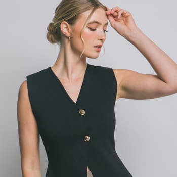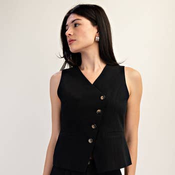 OPEN-PACK ONLY A solid-colored, round-neck sleeveless waistcoat vest top featuring a button-down front closure. Designed with a regular-length fit, this top has a split hem at the front, adding a stylish touch to its sleek silhouette. OPMT1661 Buttoned vest, tailored vest, womens clothing, work wear, trendy, solid vest, sleeveless vest, fitted vest, classic, minimalistic, spring, summer, ootd, womens tops, slim fit