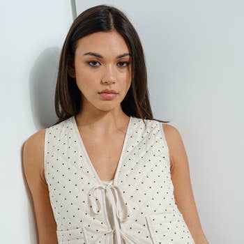 SKU: OPMT1661 Made in China Aesthetic: Classic and Minimalist Care Instructions: Hand wash Embellishment: Studded Fabric: 65% POLYESTER 35% LINEN Fit: Contemporary and Junior Occasion: Day Party and Everyday Pattern: Solid Season: Core Sleeve Length: Sleeveless Product Language: English