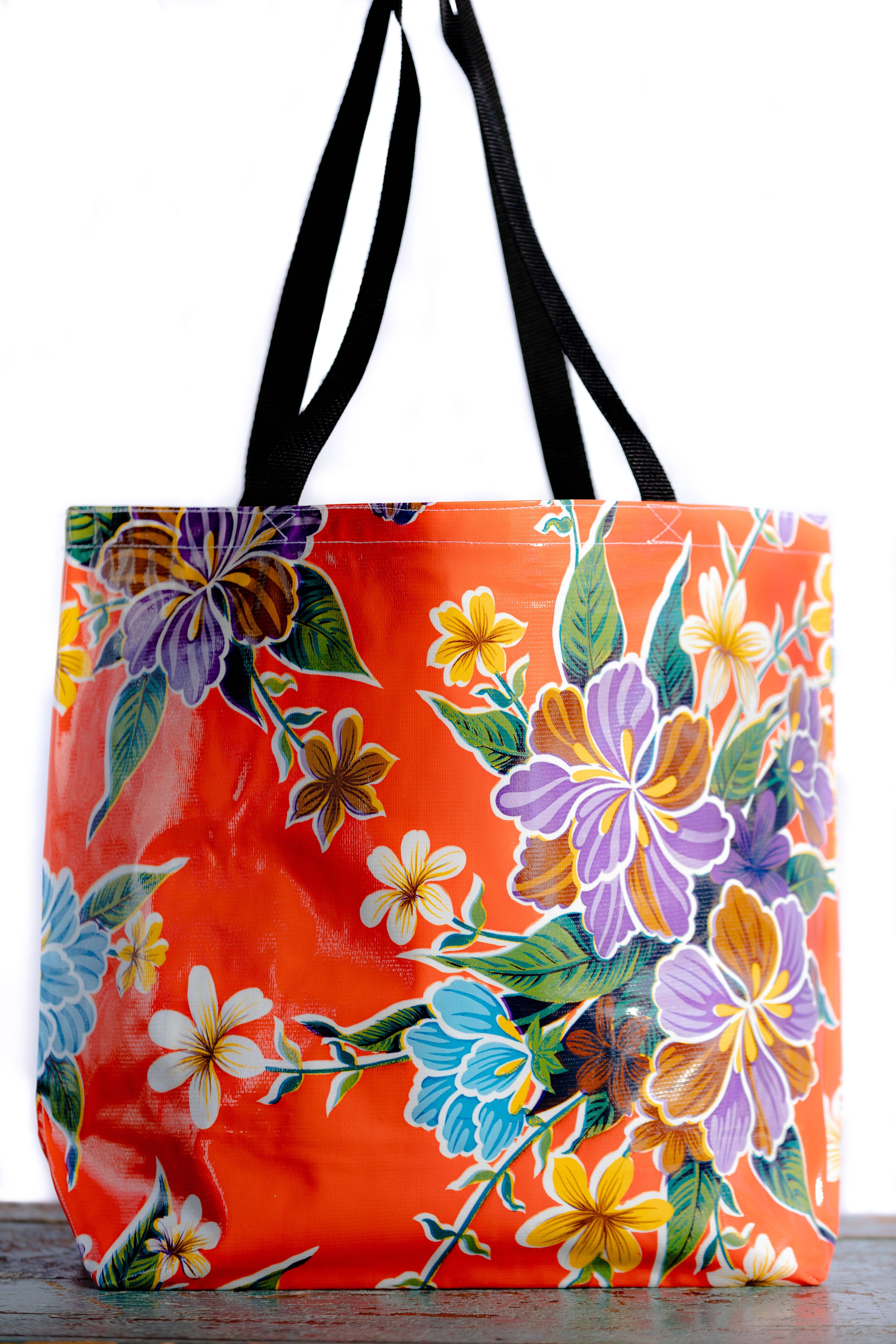 Large style lined Oilcloth tote. 20" x 15" deep, 3" gusset allows a nice width, black webbing straps. A popular print on the outer and a complimentary color for the interior. Our large totes are perfect for groceries, gym and spa, the beach and knitting supplies. Makes a great bag for babies and organizing your stuff! Wipe clean and waterproof makes for easy care. Check out our medium Tote for books, smaller loads and people! .