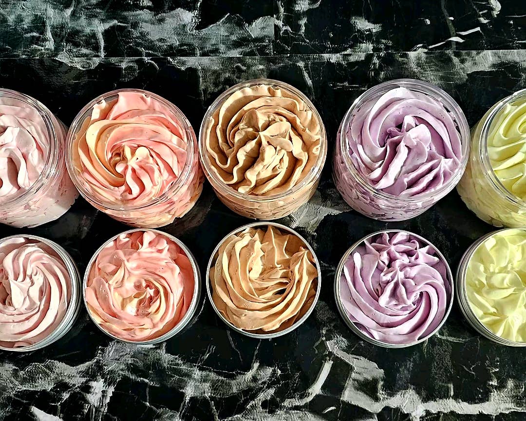 Our Fluffy Whipped Coconut Body Butter is a luxurious treat for your skin. We blend coconut oil, shea butter, and honey to create a light, airy texture that melts into your skin, providing long-lasting hydration and nourishment. The addition of coconut essential oil adds a touch of tropical bliss, promoting relaxation and skin rejuvenation. Perfect for: Dry, sensitive, or mature skin Locking in moisture after bathing or showering Soothing sun-kissed skin Massaging onto rough patches, like elbows and heels Treat your skin to the fluffy goodness!