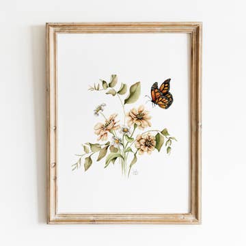 Zinnias and Monarch Butterfly Watercolor Print