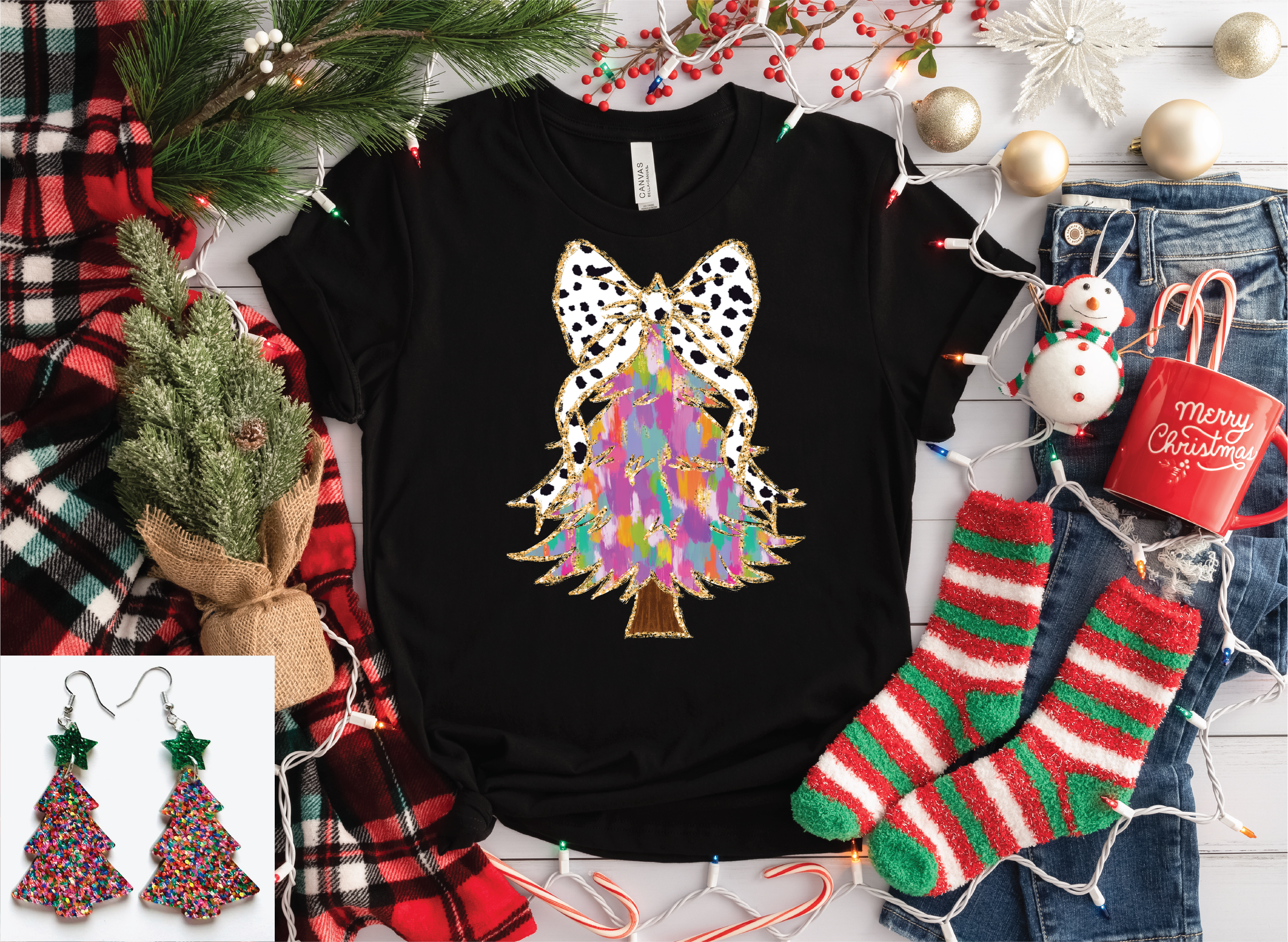 DTG on a Sand Sweatshirt *Due to inventory shortages, sweatshirts will either be Tultex or Gildan* Short Sleeve Tees are available and will be on a Bella Canvas or Next Level. Sweatshirts and tshirts are a unisex fit. Pairs perfectly with our Christmas Tree Earrings