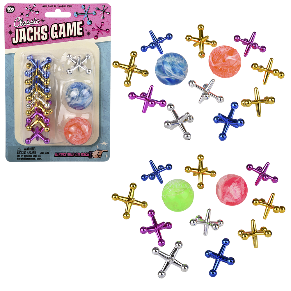 The classic jax game goes supersize. Shiny metallic jax come in several eye-catching colors, and the set includes 2 high-bounce balls that come in assorted colors. The large size makes it easier to snatch up the right number of jax on each turn. Play the classic game or use the jax for stacking for cognitive stimulation and fine-motor coordination. Can also be used for counting games. • Age Grade: 3+ • Product Dimensions/Weight: 5.8 L x 1.4 W x 8.8 H / 0.2 lb • Inner Pack Dimensions/Weight: 11.1 L x 6.4 W x 2.9 H / 0.3 lb • Made In: China • Batteries not required