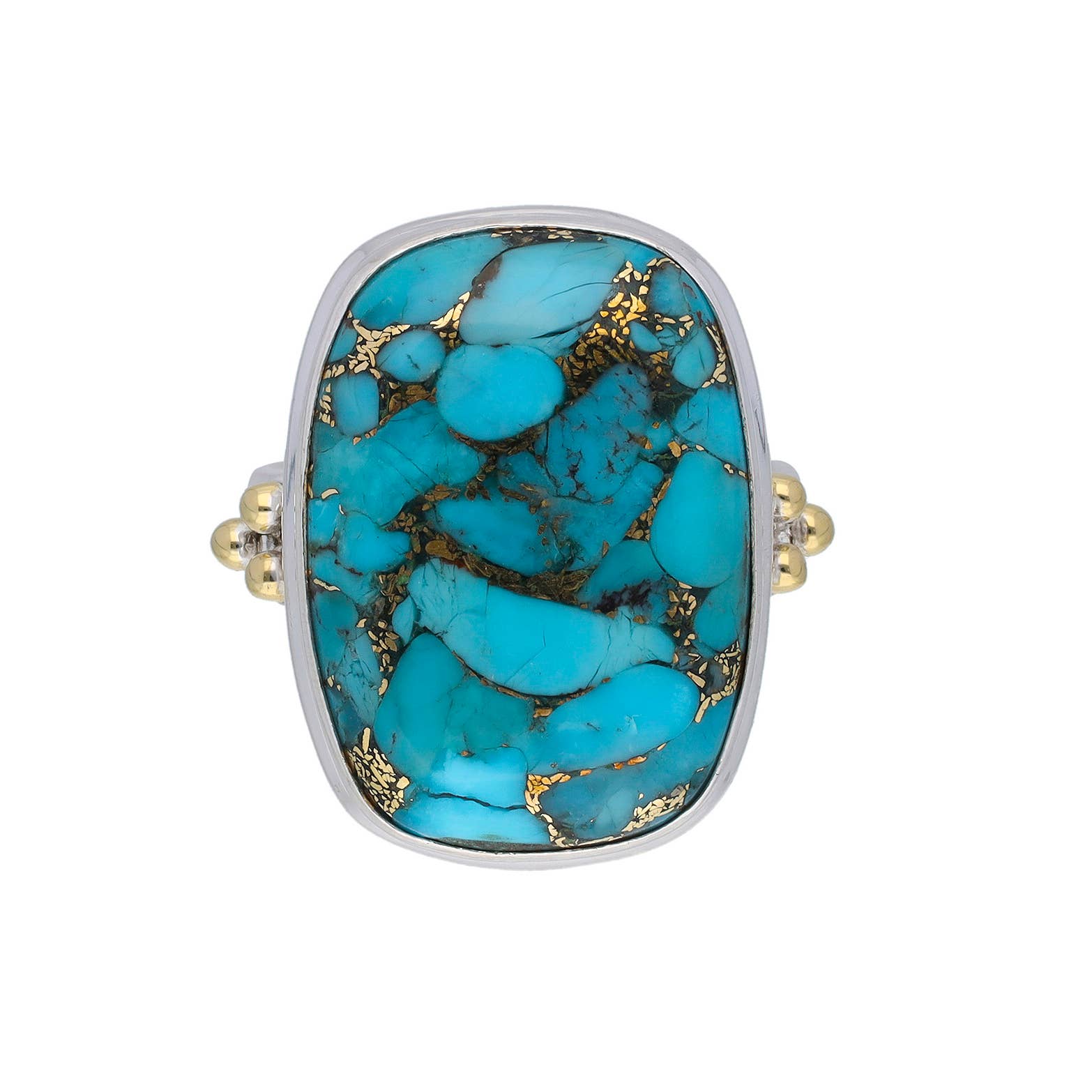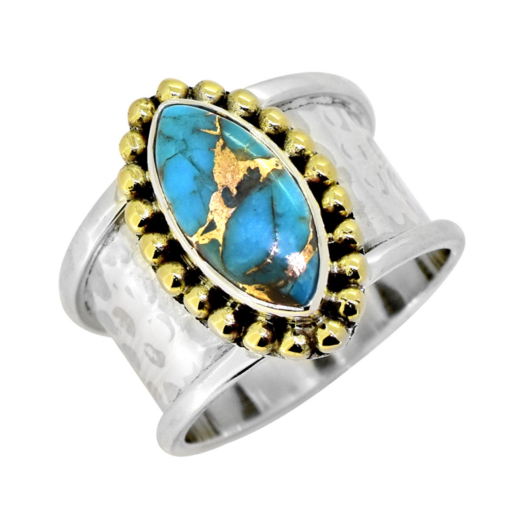 Product Specifications: Gemstone - Blue Mohave Turquoise - (Gemstone Composition - Natural, Enhancement - Stabilized) Metal - 925 Sterling Silver The silver ring with a striking turquoise stone at its center. The stone is elongated and oval-shaped, showcasing beautiful blue and green hues along with natural veining and inclusions. The turquoise is set within a decorative silver bezel accented by small, round bead-like details. The band of the ring has a split shank design, giving it a refined and intricate appearance. Its combination of vibrant turquoise and detailed silverwork makes it a captivating and artisanal piece.