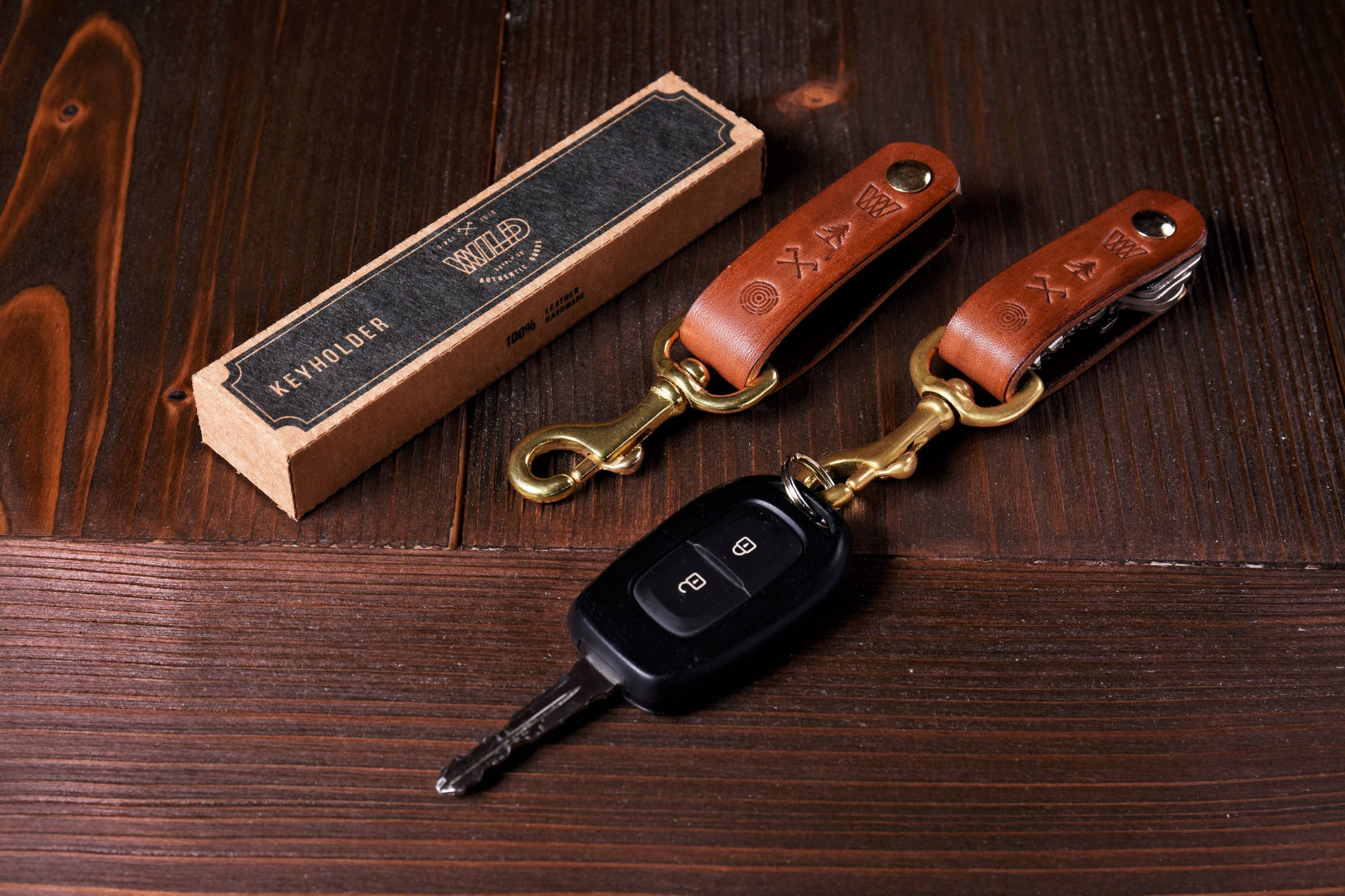 WILD'S answer to the classic jingling, unsorted bunch of keys. Casual and high-quality leather keyholder. Handmade, practical and beautiful No more annoying strumbling, organize your keys after use and slide them out like a Swiss army knife. Info: Colors: black with silver Material: 100% cowhide leather with solid brass snap hook & solid brass book screw. Key: up to 7pcs. Made by hand in Germany