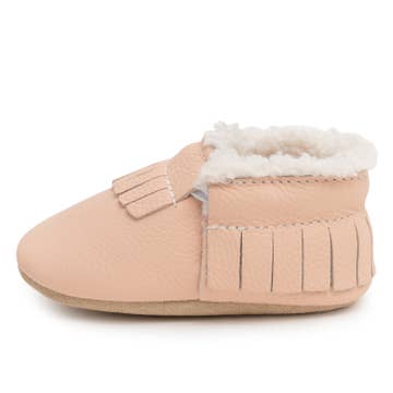 These light pink leather slip-on baby shoes are complemented by a sandy brown suede sole. Elastic around the ankles helps keep the shoes on securely yet comfortably. Ivory crochet trim adds subtle feminine detail. General sizing: 0 fits 0-3m 1 fits 3-6m 2 fits 6-9m 3 fits 9-12m Default presentation is shoes paired together with hangtag, or order display boxes here: https://www.faire.com/product/p_9huwckcxxs