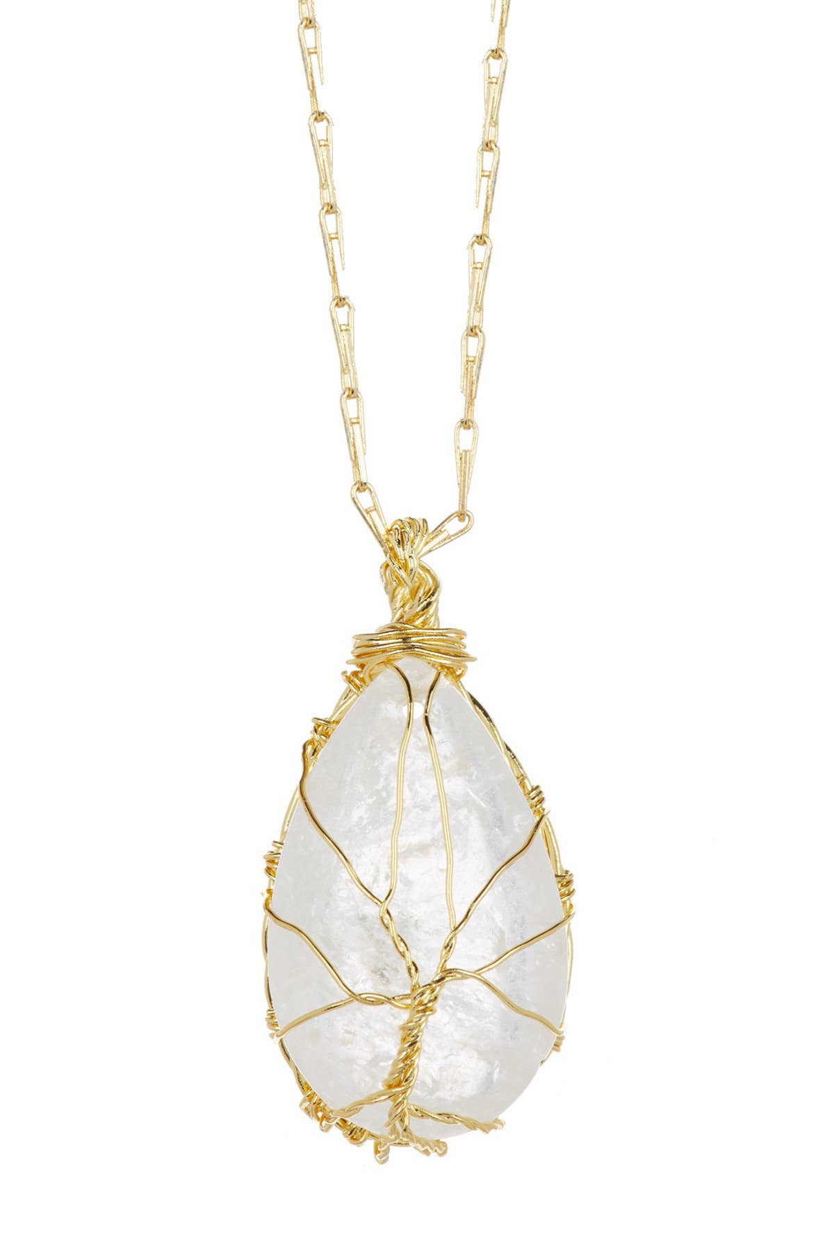 • Quartz teardrop pendant necklace • Pendant is approximately 0.75" suspended from gold geometric diamond • 28" of gold plated brass chain- Nickel Free • Due to the nature of the materials, each crystal will vary and may not be exactly as shown in the images JEWELRY CARE: To prolong the life of your jewelry, avoid contact with water, perfume, lotions etc. This will ensure your jewelry remains wearable for a long time