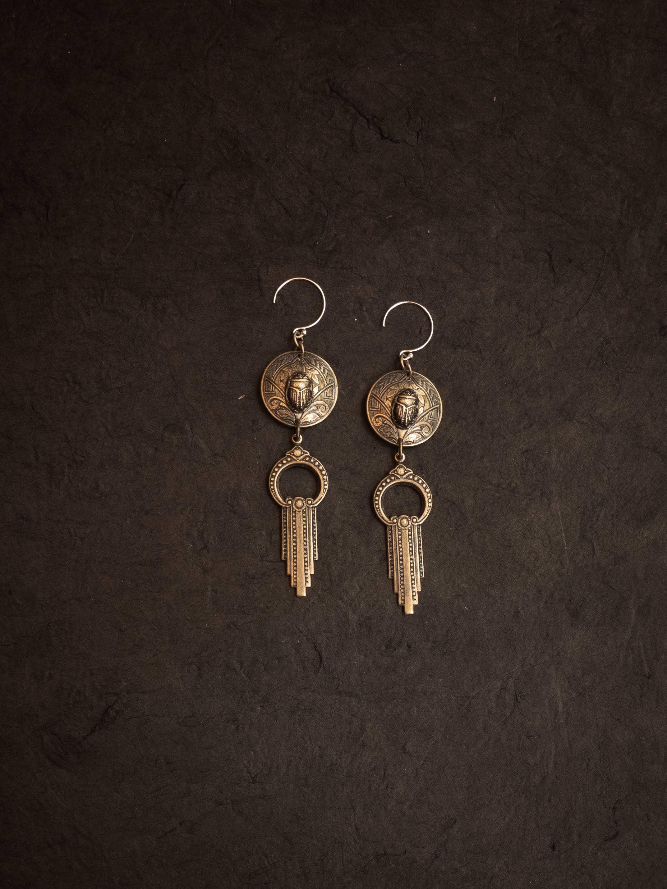 Sharp and tangled, fierce talons crush a gemstone framed in a bony bramble of filigree. A gunmetal chain is punctuated with faceted onyx beads black as a crow’s wing. At the bottom, an axe-shaped blade that has been forged to tear through flesh and illusion. Wear this amulet raw and open and mark the untamed edge of the world. In the blood-dark hush, Chain 26” Pendant with bail 2.5” -Tooled brass with antique finish -Brass bar chain with rhodium finish and onyx bead detailing -Gemstones