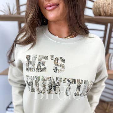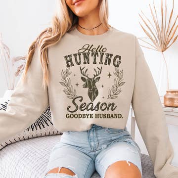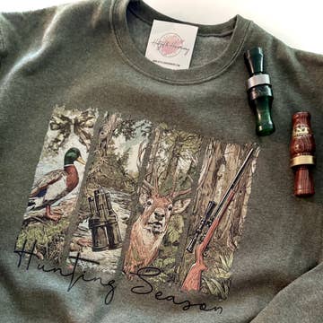 50% cotton, 50% polyester, unisex fit, long sleeve crewneck Hunting season inspired crewneck! Featuring a grey colored crewneck with a heat pressed DTF transfer this sweatshirt is designed for max comfort!