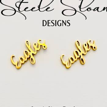 Soar with pride in these Eagle mascot earrings—bold, spirited, and full of team strength. All mascots can be customized with your team or school colors—perfect for capturing local spiritwear sales. All our earrings are brilliantly colored with UV printing on transparent acrylic. Topped with 3 layers of a clear glossy protective finish; our earrings are safe for shower and sweat *We don't recommend wearing in chlorine pools. * Earrings utilize nickel free stud posts and are hypoallergenic for sensitive ears. * Average design size is approximately a dime. * Silicone backs are included in all orders. * Handmade in rural North Texas.