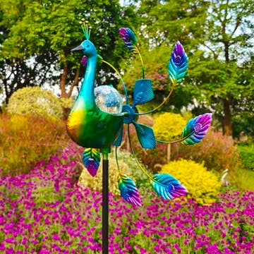 These colorful Balloon Solar Wind Spinner Stakes seemingly fly through the air when the breeze hits them. The multi-colored balloon spins one way while the 4 cup spinner below it spins the other. At night a string of LED lights illuminate the colored crackle ball. Available in 3 designs - Purple, Rainbow and Stripe.