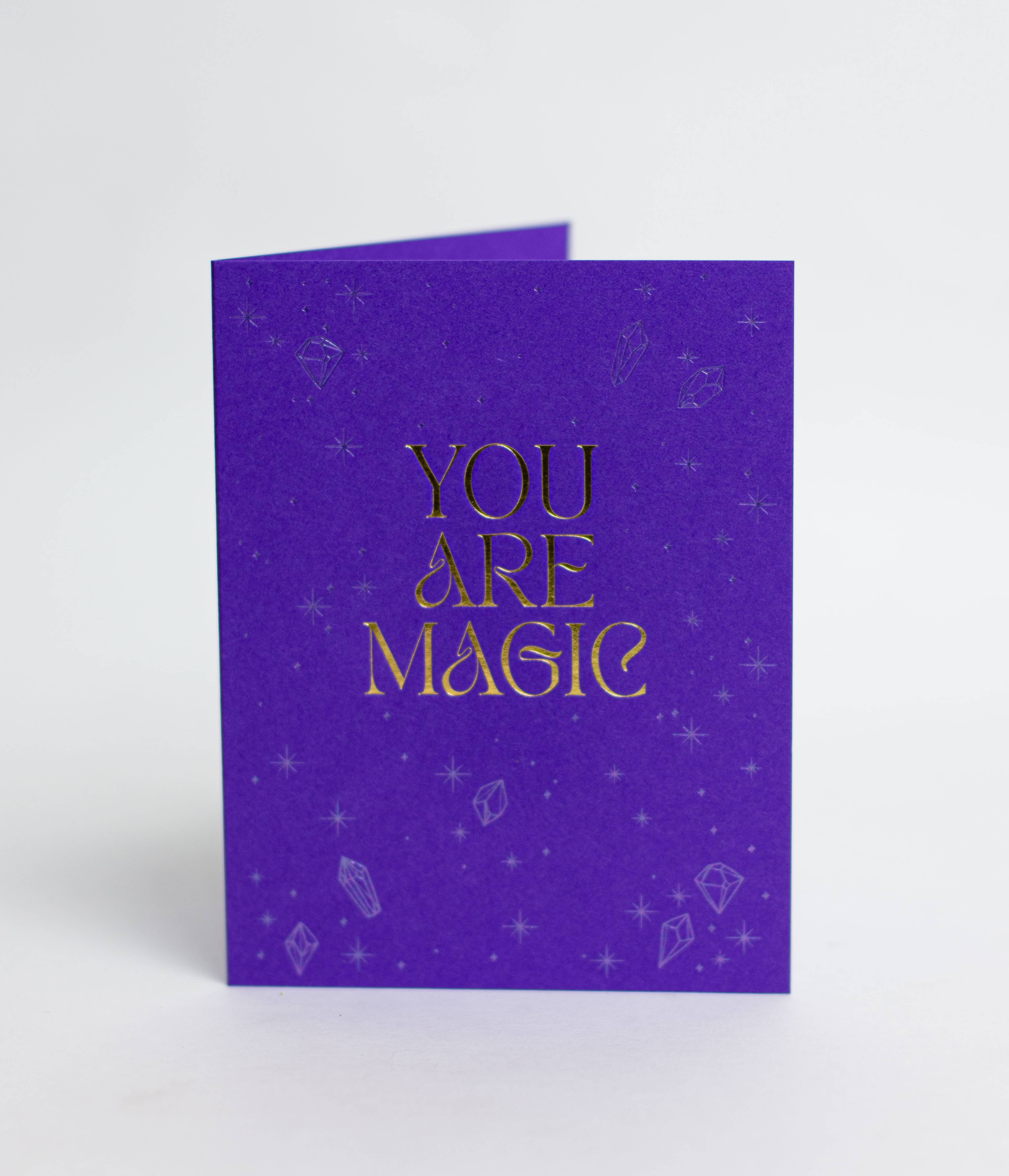 Our “You Are Magic” Letterpress Card is a dazzling way to celebrate someone’s brilliance. Whether you’re cheering on a milestone, sharing encouragement, or sending love just because, this gold-foiled design with its sparkling star clip makes every note feel extra special. A perfect card for birthdays, congratulations, or simply reminding someone of their shine. Hand-printed on a vintage letterpress in California, this card is crafted from luxe, tree-free cotton paper and finished with a heavy-duty gold star paper clip. The clip can hold a gift card or cash inside, then be reused as a bookmark, keepsake, or desk accessory—making this card both meaningful and multifunctional. Details: • Letterpress printed on a vintage press in California • Paper: Bright White, Tree-Free 100% Cotton Paper • Ink: Gold Foil • Envelope: Silver • Paper Clip: Heavy-duty gold star (multi-use as gift card/cash holder or bookmark) • Size: 5.5” x 4.25” • Folded card, blank inside • Sealed in a cello sleeve • Made in the USA Best For: • Birthdays • Congratulations • Friendship & encouragement • Everyday love notes Merchandising Tip: Pairs perfectly in acrylic countertop fixtures, 16-pocket spinners, or 48-pocket floor displays. Great for cross-merchandising with birthday gifts, graduation items, or celebratory stationery.