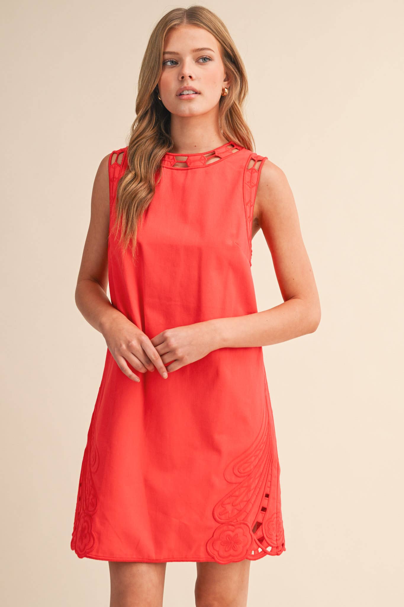 A statement mini dress featuring an intricate embroidery look with an elevated, boutique-ready feel. Designed in a flattering easy shift silhouette, it’s finished with scalloped embroidered edges at the hem and sleeves for a polished, expensive-looking touch. The softly flared sleeves add movement and coverage, while the dress is fully lined for comfortable, worry-free wear. Perfect for brunch, vacation, weekend events, and effortless day-to-night styling. Elevated embroidered look for a premium feel Scalloped embroidered hem & sleeve edges Relaxed shift fit (easy, flattering, versatile) Flared sleeves for feminine shape + comfort Fully lined STYLE# : LWD3392 SELF : 100% COTTON LINING : 100% POLYESTER