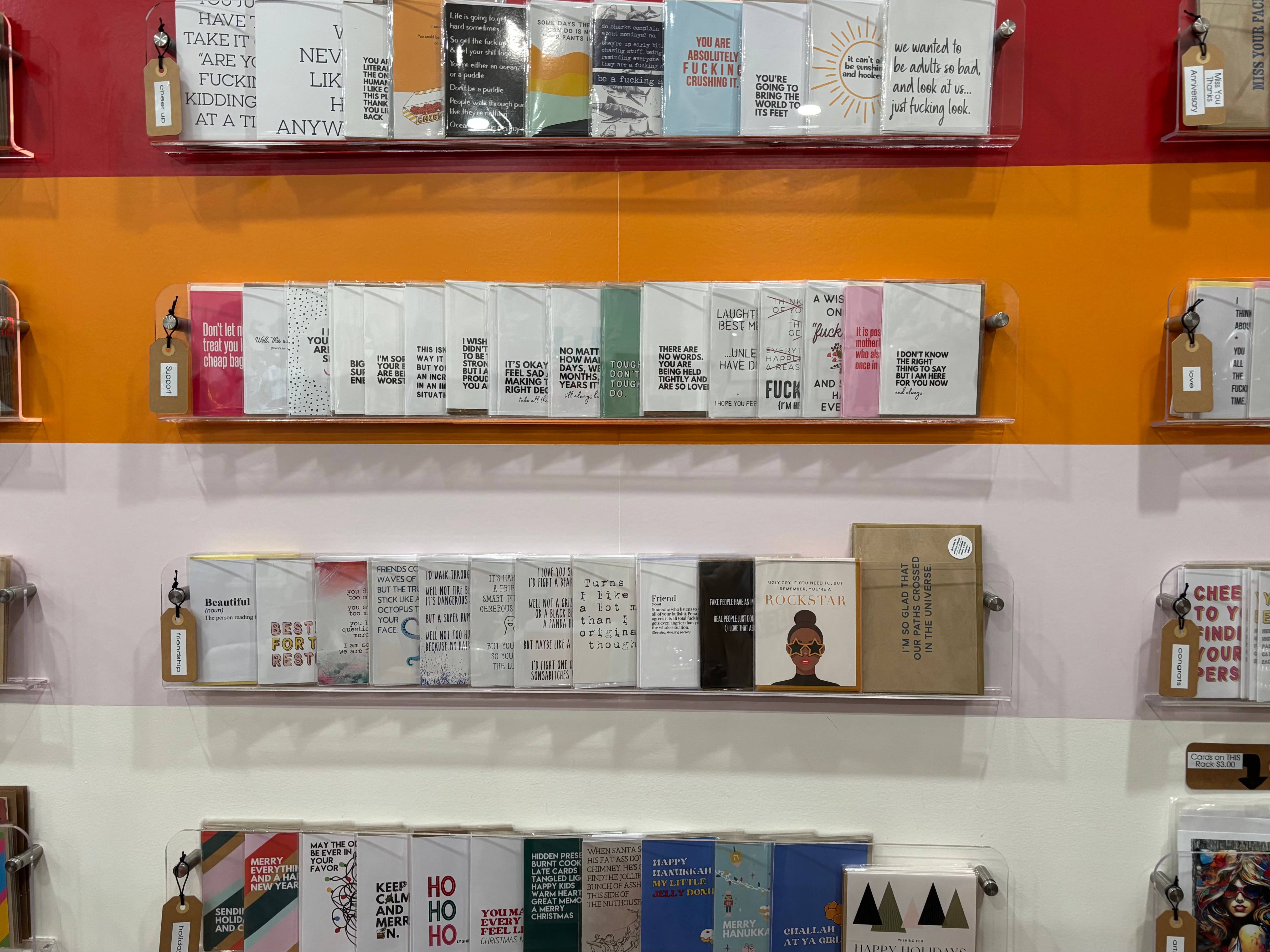 my patrons and myself alike adore these cards and the wide assortment of fun yet supportive sentiments. so unusual.