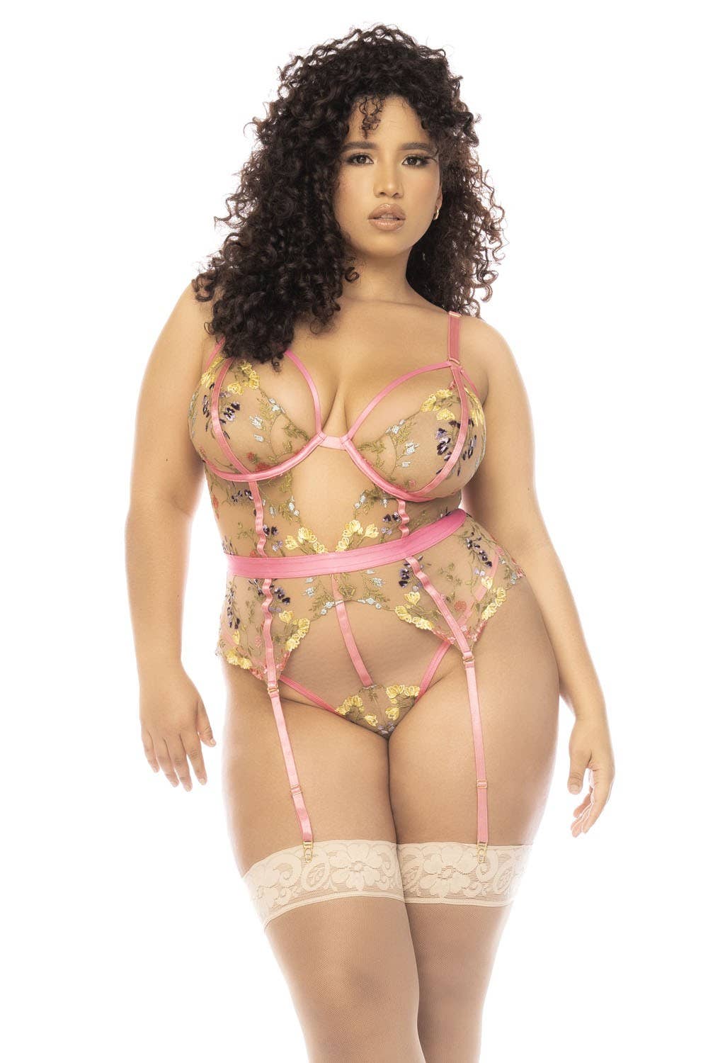 Plus size lingerie, bra and panties made from recycled fibers Small lingerie set, large size, in fine floral lace made from recycled fibers. Bra with lined cups and adjustable straps and matching high-waisted panties. Recycled fibers that are gentle on the skin. A classic but sensual set to wear every day. Composition: 86% Polyamid 14% Elastane