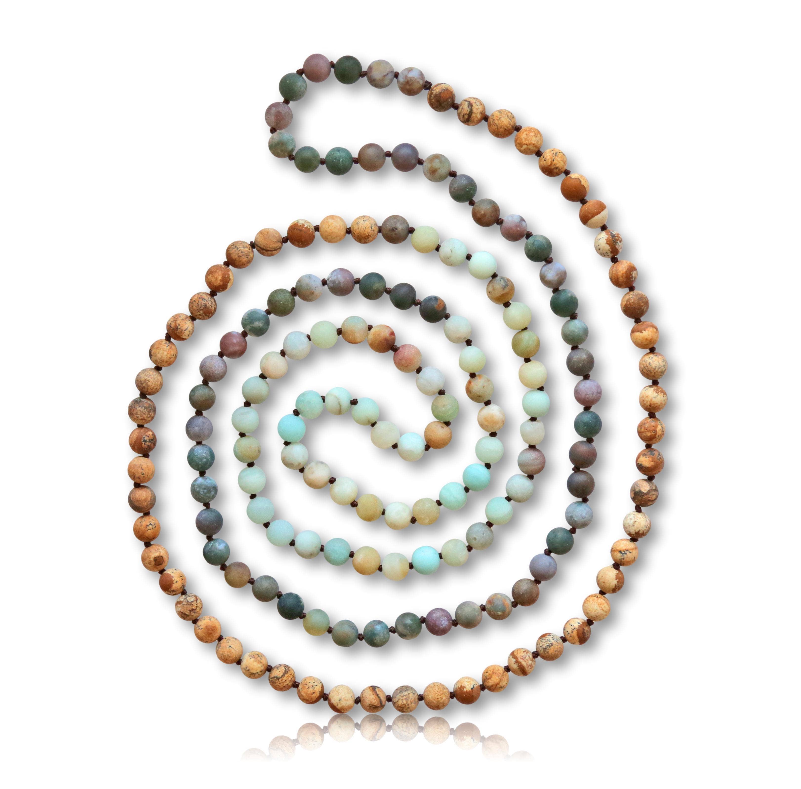 Necklace Length: 40"L. Major Beads/material: Amazonite free form nugget 7x10MM approx; matte picture jasper: 8MM round beads; free form labradorite nuggets: 7x10MM approx.; cultured fresh water pearls: 9-10MM. No Clasp. Workmanship: Hand strung and each bead is hand-knotted.