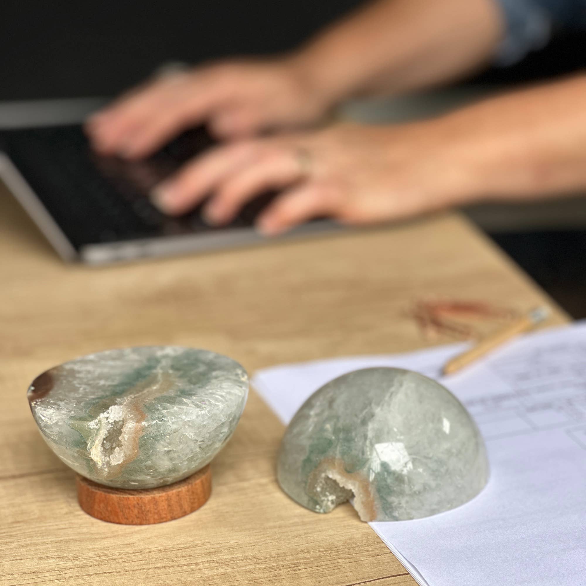 Crafted from genuine Uruguayan crystal slices. Each charm features the mesmerizing cross-section of a natural amethyst stalactite—formed over millions of years and hand-selected for its beauty and energy. - 2-3 inches in diameter - Set in a natural suede string Each piece is truly one of a kind, with variations in color, shape, and pattern that highlight the natural artistry of the Earth. No two charms are ever alike—making them perfect for customers seeking something special and unique. We offer a variety of suede cord colors to match with the different color palette of the stalactites.