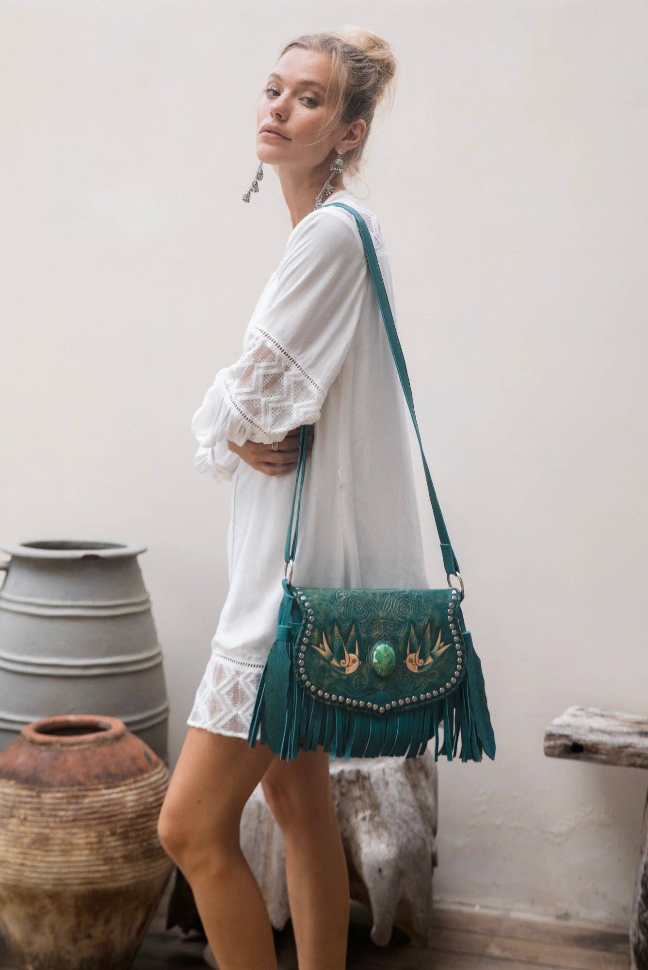 Details: * Hand-tooled & hand-painted Feather design waist belt in cow leather with a Turquoise gemstone on a leather concho * Silver buckle & 7 holes at back on a strap to fasten Measurements: XS Length body 65cm (not include strap with holes)/Strap is 15cm extra overhang with 7 holes/Length from end to first hole 63cm & last hole 76cm/Width 10cm S Length body 69.5cm (not include strap with holes)/Strap is 15cm extra overhang with 7 holes/Length from end to first hole 70cm & last hole 83cm/Width 10cm M Length body 74.5cm (not include strap with holes)/Strap is 15cm extra overhang with 7 holes/Length from end to first hole 73.5cm & last hole 87cm/Width 10cm L Length body 79cm (not include strap with holes)/Strap is 15cm extra overhang with 7 holes/Length from end to first hole 78cm & last hole 91cm/Width 10cm XL Length body 83cm (not include strap with holes)/Strap is 15cm extra overhang with 7 holes/Length from end to first hole 83cm & last hole 97cm/Width 10cm