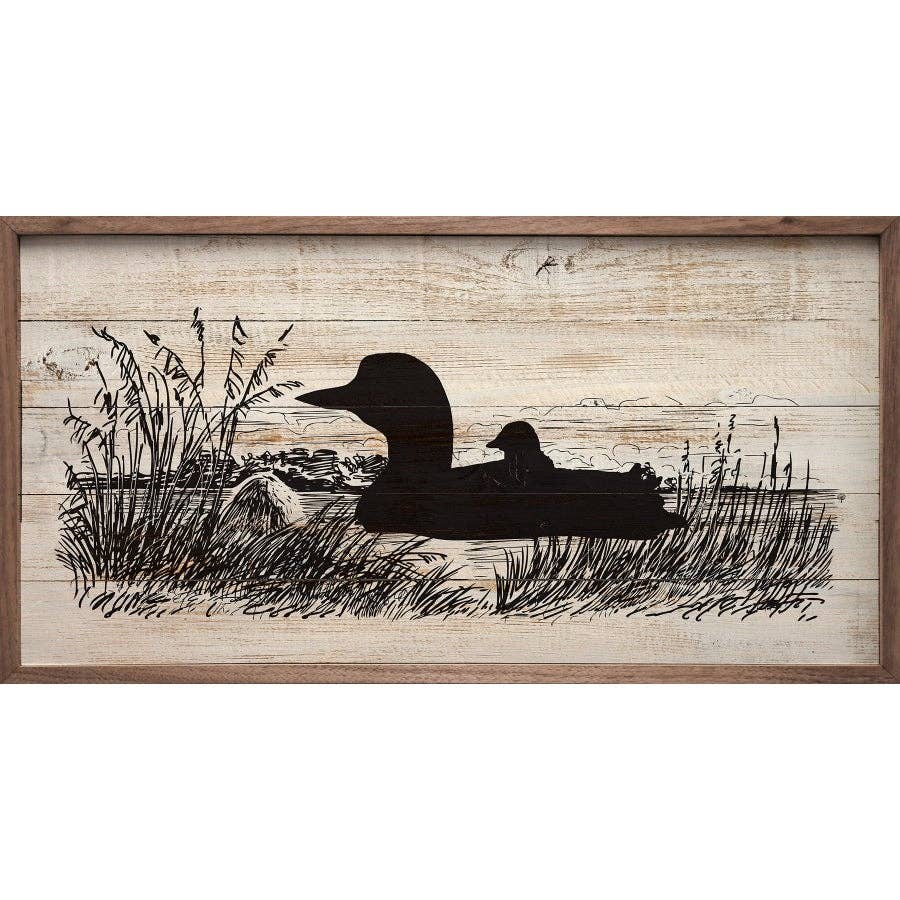 Needlework duck reproduction on a distressed background in wooden frame behind glass