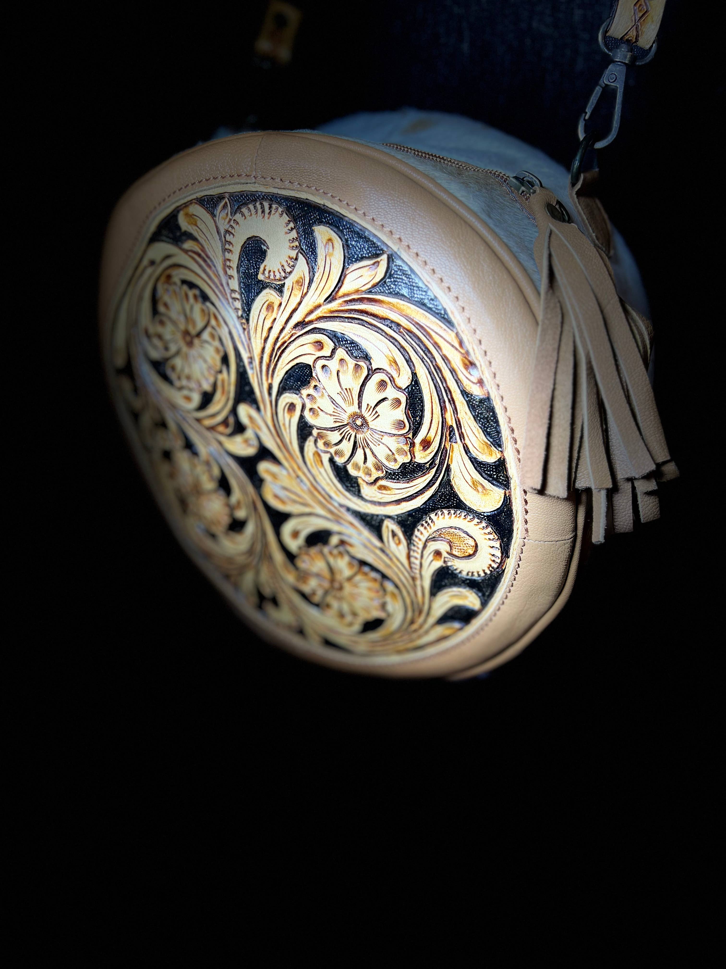 Similar to our fringed cowhide duffle but without any fringe. Large tooled leather and cowhide duffel bag. Roomy enough for the perfect weekend getaway. Heavy duty leather with full top zip closure. The tooled leather is sewn with buck stitching. Comes with removable adjustable shoulder strap. Measures approximately 22” wide.
