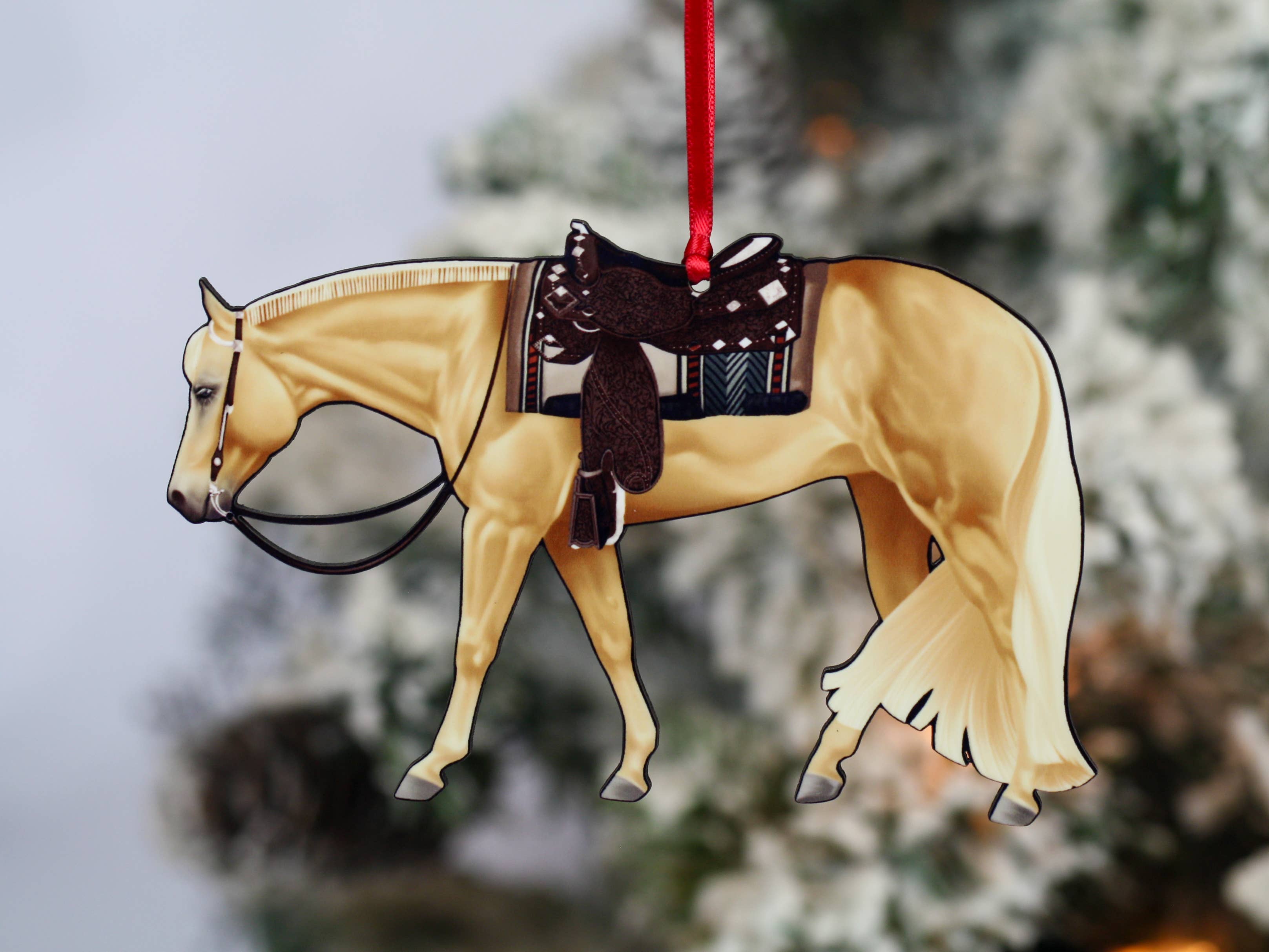 Here's a chestnut tobiano western pleasure Paint Horse ornament that would be lovely for display year around as well as Christmas. Includes red and black ribbons for hanging. This hand made 1/8" thick composite wood laser cut horse would look great on an equestrian's Christmas tree during the holidays, on the mantel, hanging on the wall or wherever is most fitting. The ornament will come with a gift box which is perfect for your customer to use for easy gifting and for storage once the holidays are over. .125" thick composite wood is laser cut and printed to make unique horse ornaments exclusive to Classy Equine. The back side of the ornament is a dark brown. The printed front side is glossy. Available in Black, Bay, Chestnut, Light Gray, Black and White Tobiano, Chestnut and White Tobiano, Bay Tobiano, Buckskin, Palomino, Grulla, Leopard Spotted Appy, and Blanket Appy. Feel free to request additional coat colors. Ornament dimensions - 3.25" tall x 5" wide and .125" thick.